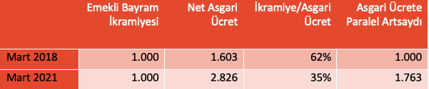Asgari ücretinin 1.603 TL olduğu 2018 yılında belirlen bayram ikramiyesi, asgari ücretin yüzde 62’si tutarında belirlenmiş oldu. Aradan geçen üç yılda 1.000 TL bayram ikramiyesine herhangi bir zam uygulanmadı. 2018 yılında görülmeye başlayan ekonomik kriz ve 2020 yılında başlayan Covid-19 salgını sebebiyle enflasyon tırmanır ve gelir kayıpları yaşanırken emekli ikramiyeleri yerinde saydı. Emekli bayram ikramiyesi ödenmeye başlandığı 2018 yılına göre hem asgari ücrete göre geriledi hem de yüksek enflasyon sebebiyle eridi.
