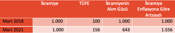Artan fiyatlar karşısında da emekli bayram ikramiyesinin alım gücü düştü. Mart 2018 ve 2021 arasındaki üç yıllık dönemde TÜFE (Tüketici Fiyat Endeksi) yüzde 56 oranında arttı. Buna karşılık emekli bayram ikramiyelerinde herhangi bir artış yaşanmadı. Böylece emekli bayram ikramiyesi enflasyon karşısında yüzde 56 eridi. Emekli ikramiyesi üç yılda enflasyona göre artırılsaydı en az 1.556 TL olması gerekirdi (Tablo 2). Böylece emekli ikramiyesinin enflasyon karşısındaki kaybı bir yılda 1.286 TL olarak gerçekleşti.