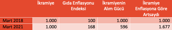 Bilindiği gibi gıda enflasyonu ortalama enflasyona göre daha yüksek seyretmektedir. Dolayısıyla emekli ikramiyesinin gıda enflasyonu karşısındaki kaybı genel enflasyon karşısındaki kaybına göre daha da fazla oldu. Mart 2018’den Mart 2021’e geçen sürede gıda enflasyonu yüzde 68 oranında arttı. 1.000 TL’lik emekli bayram ikramiyesinin alım gücü üç yılda 596 TL’ye düştü. Oysaki emekli bayram ikramiyesi gıda enflasyonu kadar artırılmış olsaydı 2021 yılı için en az 1.677 TL olması gerekirdi (Tablo 3). Böylece emeklilerin gıda enflasyonu karşısındaki kaybı bir yıl için toplamda 1.354 TL oldu.