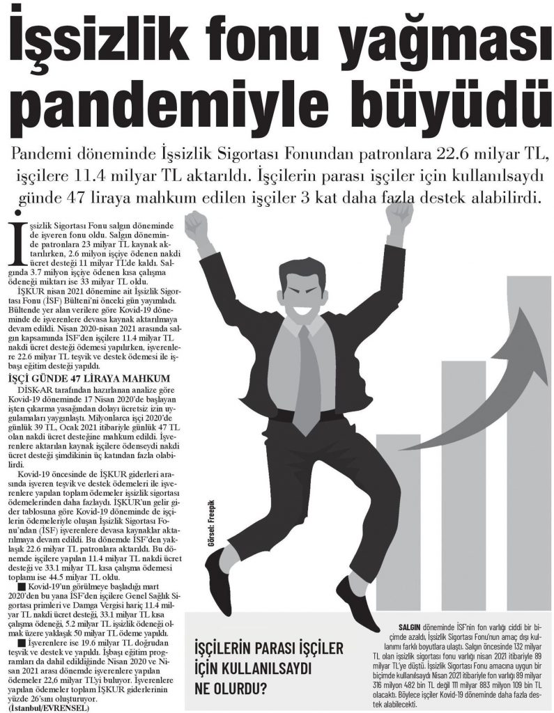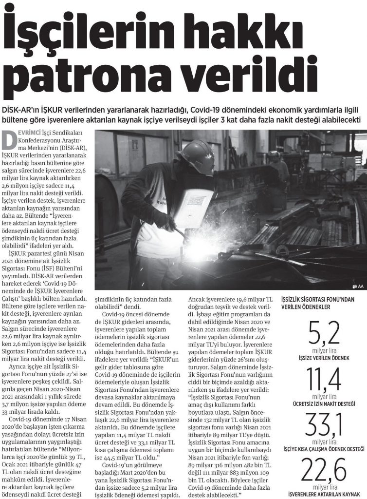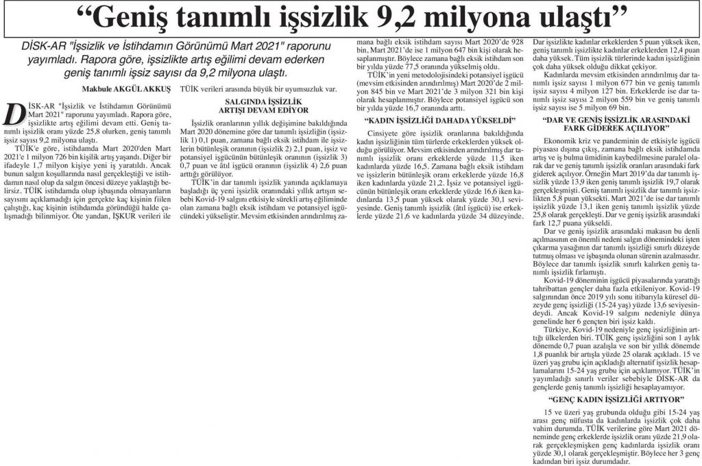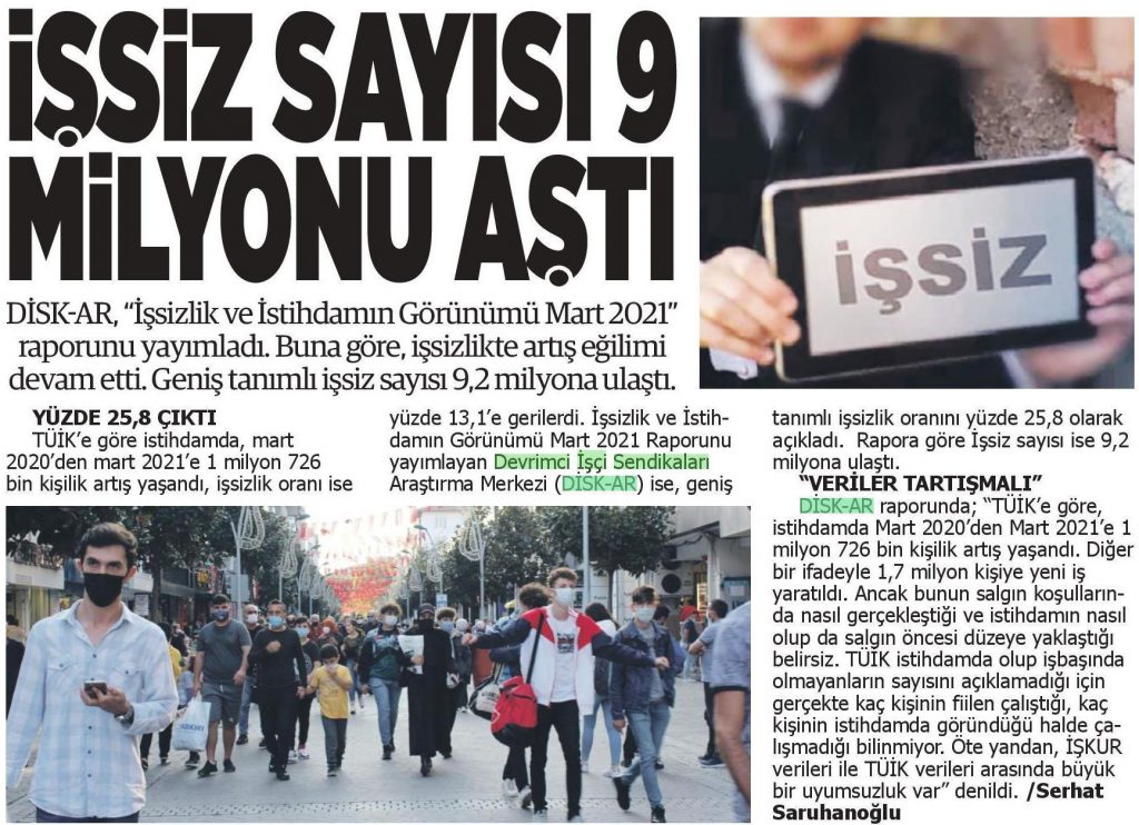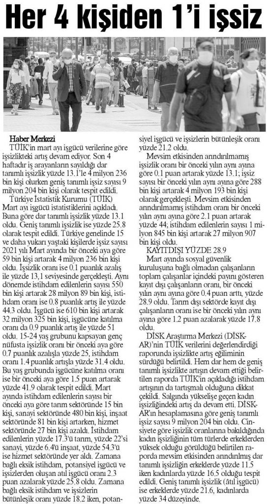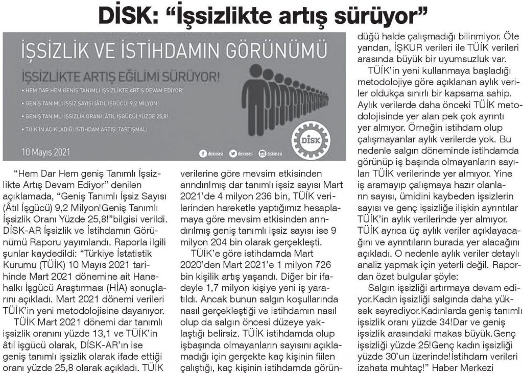 DİSK-AR tarafından hazırlanan “19 Mayıs’ta gençler ne eğitimde ne istihdamda“, “İŞKUR Covid-19 döneminde de işverenlere çalıştı” ve “İşsizlik ve İstihdamın Görünümü-Mart 2021” araştırmaları 12 Mayıs 2021, 17 Mayıs 2021, 19 Mayıs 2021 ve 20 Mayıs 2021 tarihli yazılı basında yer aldı.