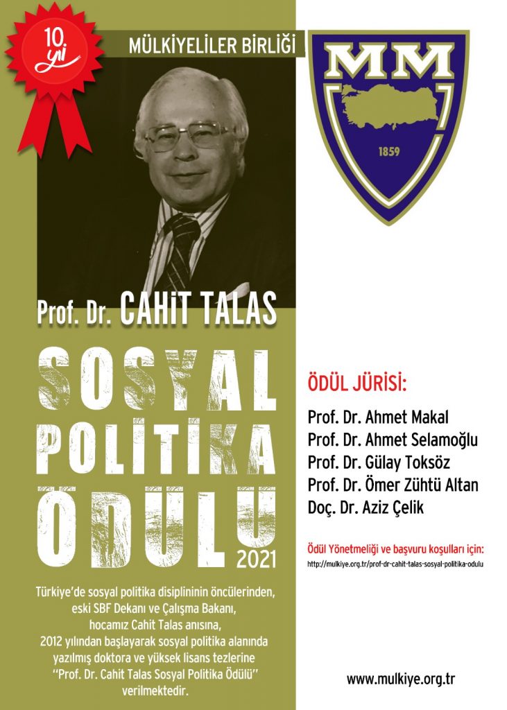 “Türkiye’de sosyal politika disiplininin öncülerinden hocamız Cahit Talas adına 2012 yılında tesis ettiğimiz ve 2017’den bu yana da Mülkiyeliler Birliği’nin çatısı altında düzenlenen ‘Prof. Dr. Cahit Talas Sosyal Politika Ödülü’ 2021 yılında 10. defa verilecektir. Ödül’e başvuranlar, doktora ya da yüksek lisans tezleri ile kendilerinden istenen diğer belgelerin tümünü internet ortamında [email protected] adresine göndereceklerdir. Ödül’e başvurular, 15 Eylül 2021 günü mesai saati bitimine kadar yapılabilir. Ödül ile ilgili diğer açıklamalar Mülkiyeliler Birliği’nin web sitesinde ‘Ödüller’ sekmesinde yer almaktadır. Ödül’le ilgili her türlü iletişim için [email protected] adresi kullanılabilir. Sosyal politika alanındaki doktora ya da yüksek lisans tezleriyle Ödül’e başvuracak tüm adaylara şimdiden başarılar diliyoruz…”