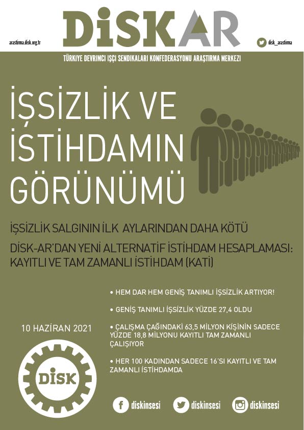 TÜİK Nisan 2021 dönemi gösterge işsizlik oranı olarak ifade ettiği mevsim etkisinden arındırılmış dar tanımlı işsizlik oranını yüzde 13,9 ve TÜİK’in âtıl işgücü olarak adlandırdığı, DİSK-AR’ın ise geniş tanımlı işsizlik olarak ifade ettiği oranı yüzde 27,4 olarak açıkladı. Böylece mevsim etkisinden arındırılmış dar tanımlı işsizlik oranı son bir yılda 0,2 puan, bir aylık dönemde ise 0,9 puan arttı. Mevsim etkisinden arındırılmış geniş tanımlı işsizlik (âtıl işgücü) oranı ise son bir yılda 0,6 puan azaldı ve son bir aylık dönemde ise 0,9 puan arttı.