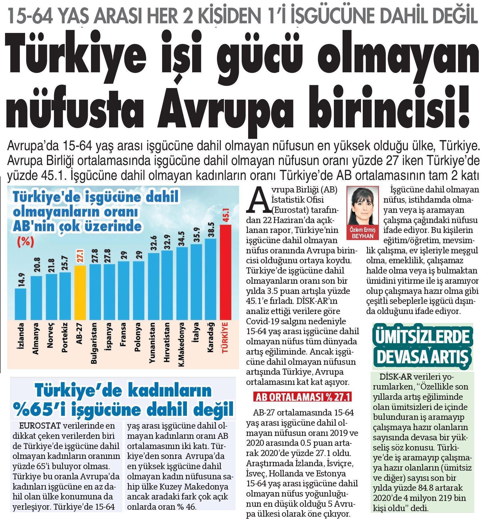 “Türkiye işgücüne dahil olmayan nüfusta Avrupa birincisi” adlı araştırma bülteninin basına yansıması-1 24 Haziran 2021 DİSK-AR tarafından hazırlanan ve 23 Haziran 2021 günü yayımlanan “Türkiye İşgücüne Dahil Olmayan Nüfusta Avrupa Birincisi” isimli araştırma bülteni 24 Haziran 2021 tarihli Sözcü gazetesinde yer aldı. Sözcü, 24 Haziran 2021.