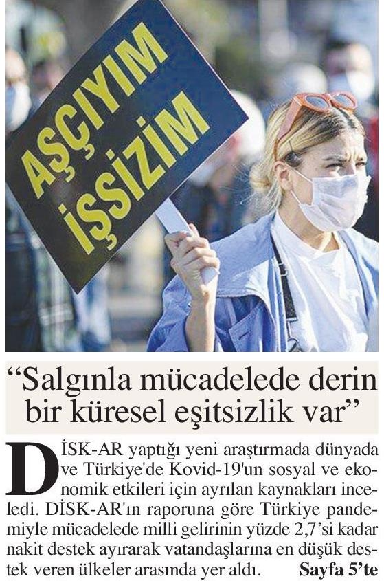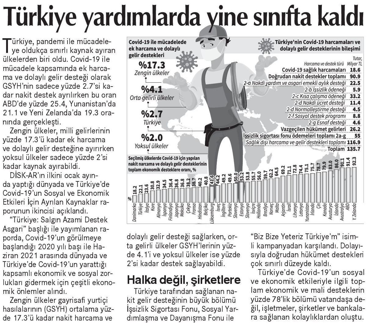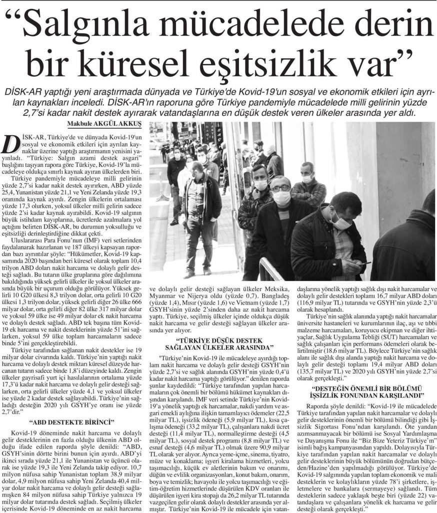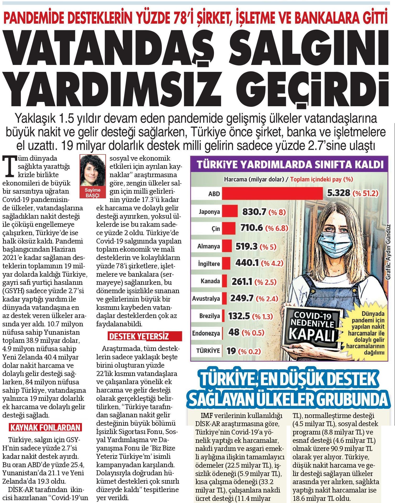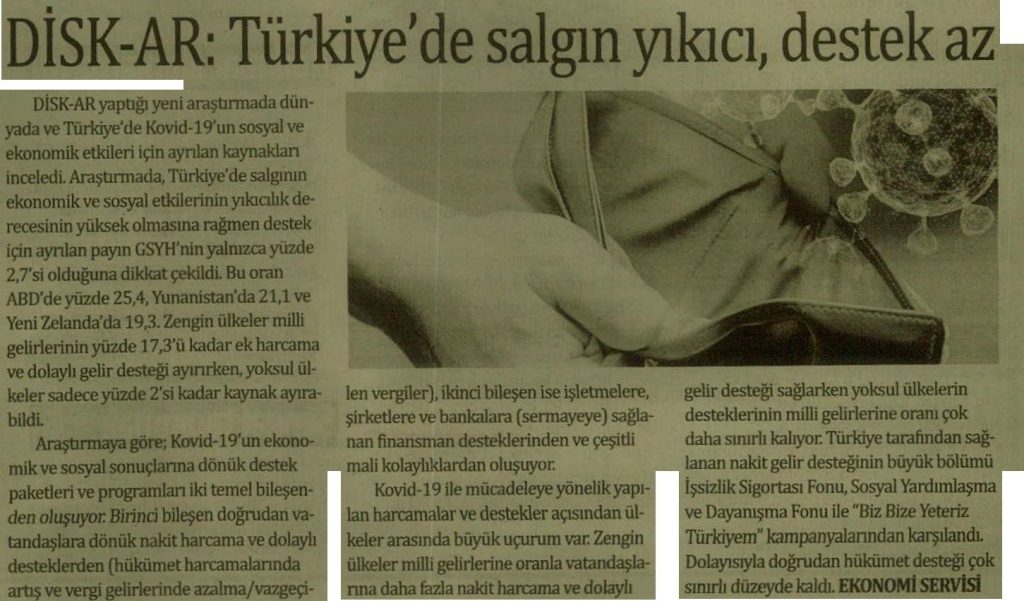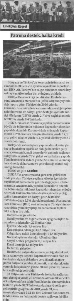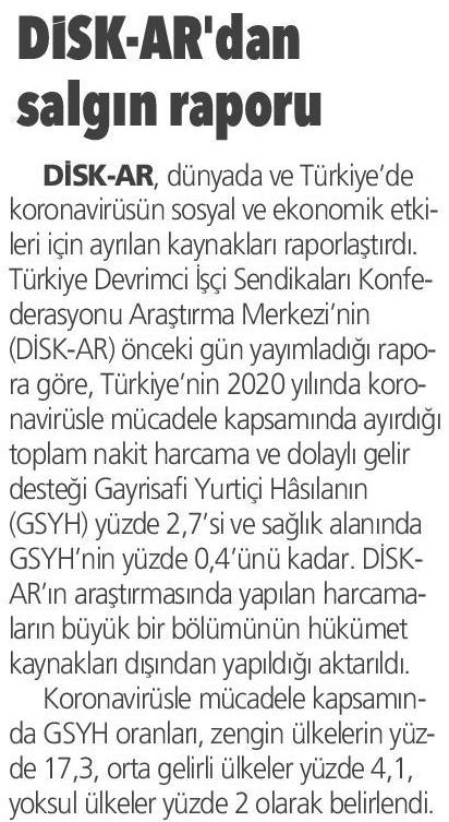 Dünyada ve Türkiye’de Covid-19’un Sosyal ve Ekonomik Etkileri İçin Ayrılan Kaynaklar (2) araştırması basına yansımaları-2 5 Ağustos 2021 DİSK-AR tarafından hazırlanan ve 3 Ağustos 2021 tarihinde yayımlanan “Dünyada ve Türkiye’de Covid-19’un Sosyal ve Ekonomik Etkileri İçin Ayrılan Kaynaklar (2)” isimli araştırma bülteni 5 Ağustos 2021 tarihli yazılı basında yer aldı. Aydınlık, 5 Ağustos 2021. Cumhuriyet, 5 Ağustos 2021. Sözcü, 5 Ağustos 2021. Yeni Yaşam, 5 Ağustos 2021. Başkent Ankara, 5 Ağustos 2021. Başkent Ankara, 5 Ağustos 2021. Yeni Bakış Gazetesi, 5 Ağustos 2021.