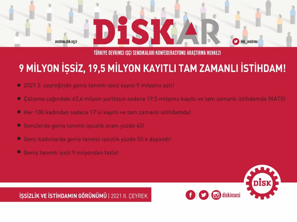 TÜİK’e göre mevsim etkisinden arındırılmış dar tanımlı işsiz sayısı 2021 2. çeyrekte, 2020 2. çeyreğe göre 184 bin kişi azalarak 3 milyon 989 bin olarak gerçekleşti. DİSK-AR tarafından TÜİK verilerinden yararlanarak hesaplanan geniş tanımlı işsiz sayısı ise 2021 2. çeyrekte 9 milyon 38 bin oldu.