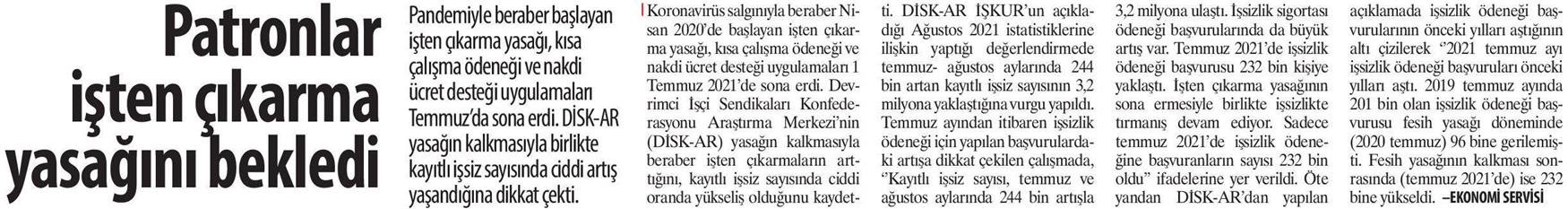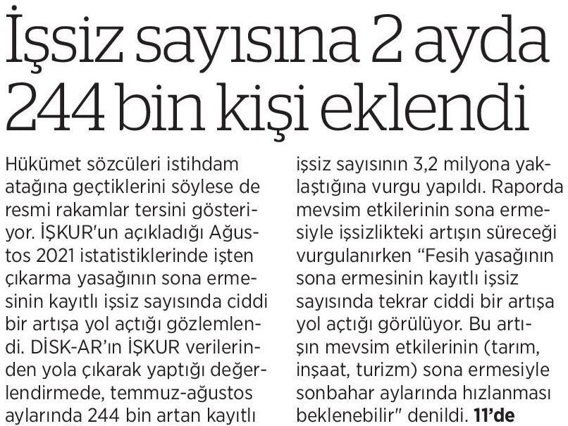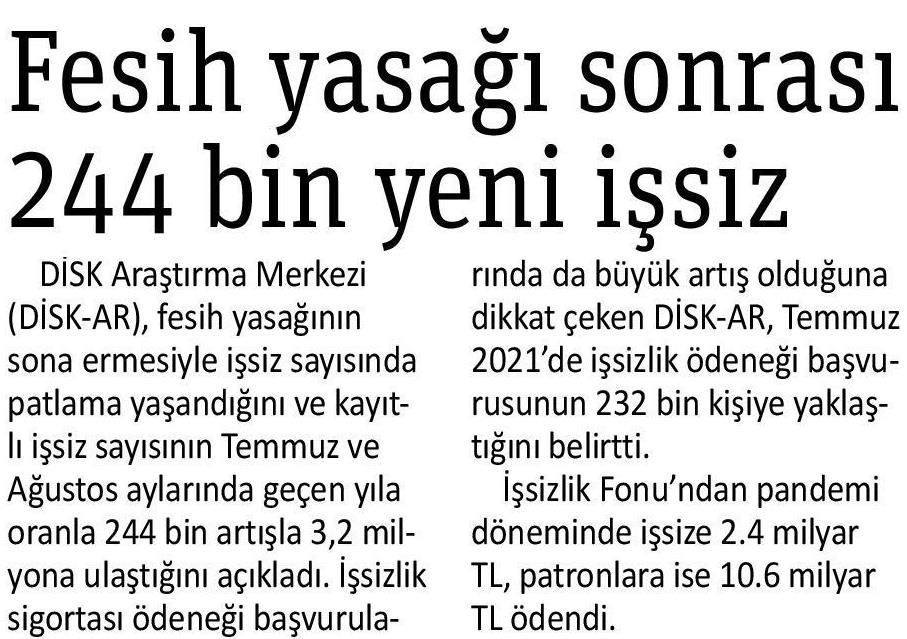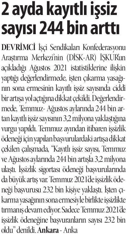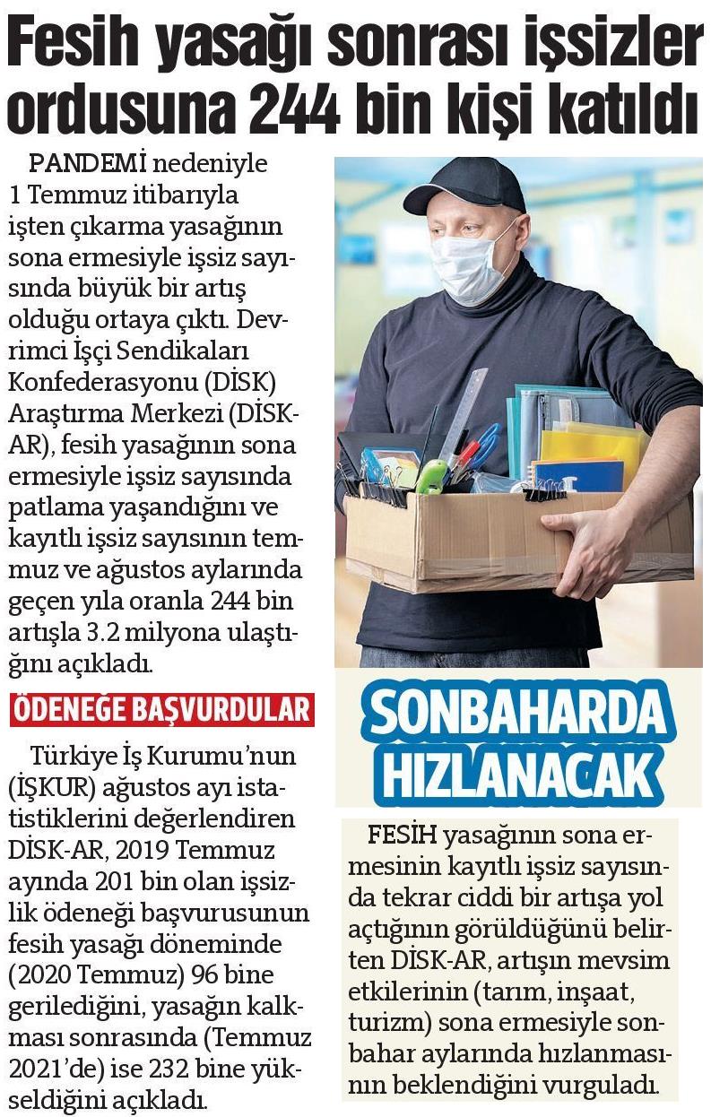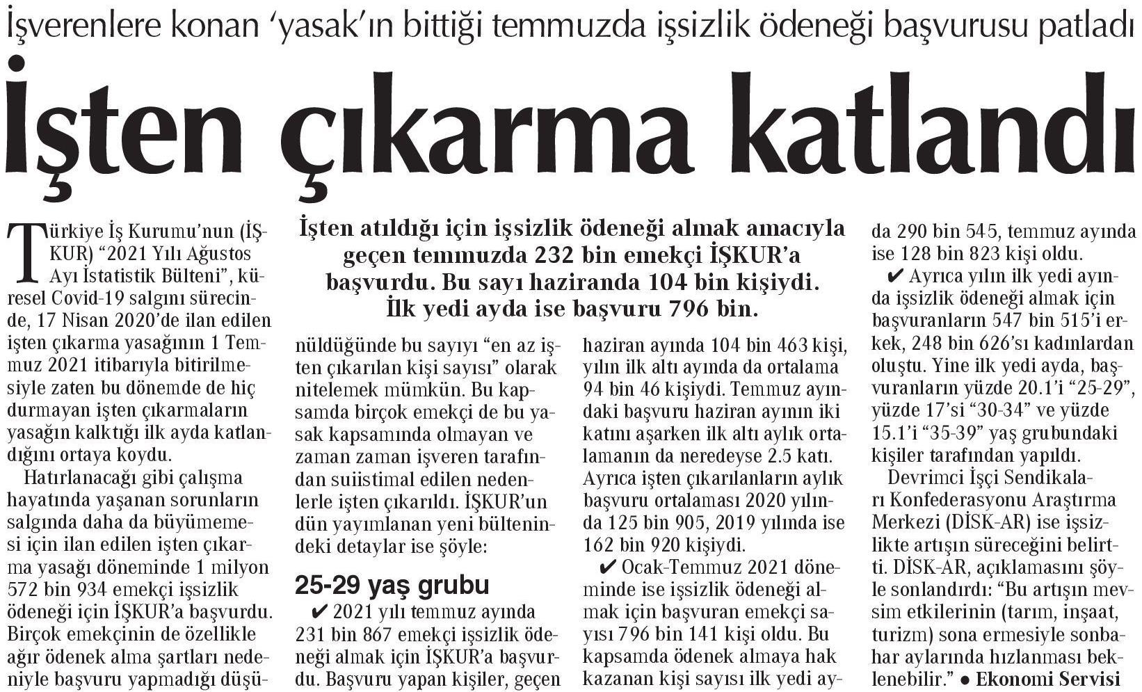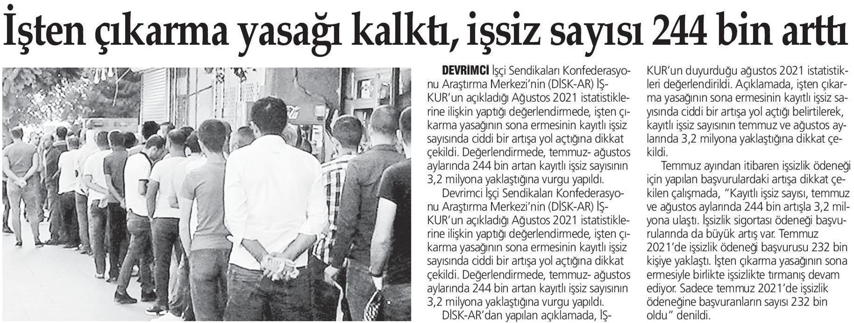 DİSK-AR’ın 8 Eylül 2021 tarihinde İŞKUR verilerine ilişkin yaptığı değerlendirmeye 9 Eylül 2021 tarihli yazılı basında yer verildi.