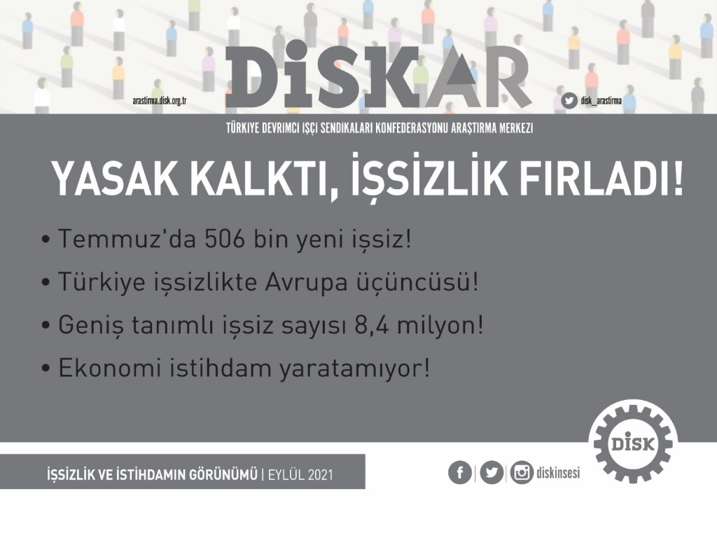 Türkiye İstatistik Kurumu (TÜİK) 10 Eylül 2021 tarihinde Temmuz 2021 dönemine ait Hanehalkı İşgücü Araştırması (HİA) sonuçlarını açıkladı. Haziran 2021’de işten çıkarma yasağının kalkmasının ardından dar tanımlı işsiz sayısında patlama yaşandı. Temmuz 2020’de mevsim etkisinden arındırılmış (MEA) dar tanımlı işsiz sayısı 4 milyon 449 iken Temmuz 2021’de 3 milyon 902 bine düştü. TÜİK Temmuz 2021 dönemi gösterge işsizlik oranı olarak ifade ettiği MEA dar tanımlı işsizlik oranını yüzde 12,0 ve TÜİK’in âtıl işgücü olarak adlandırdığı, DİSK-AR’ın ise geniş tanımlı işsizlik olarak ifade ettiği oranı ise yüzde 23,6 olarak açıkladı. Mevsim etkisinden arındırılmış (MEA) geniş tanımlı işsizlik (âtıl işgücü) oranı son bir aylık dönemde ise 1,2 puan arttı. Geniş tanımlı işsizlik Temmuz 2019’dan Temmuz 2021’e 1 milyon 790 bin kişi artarak 8 milyon 421 olarak hesaplandı.