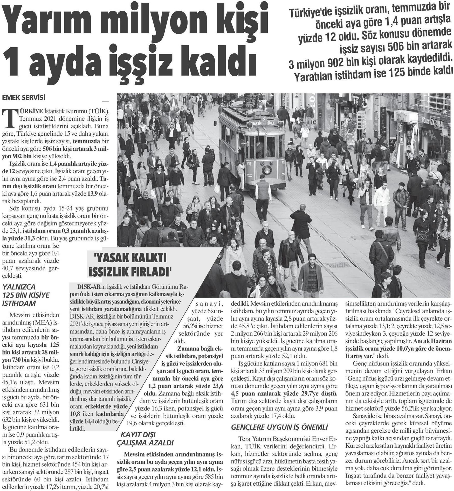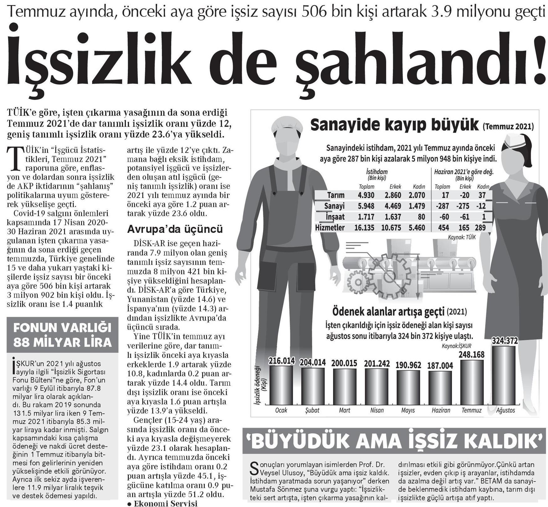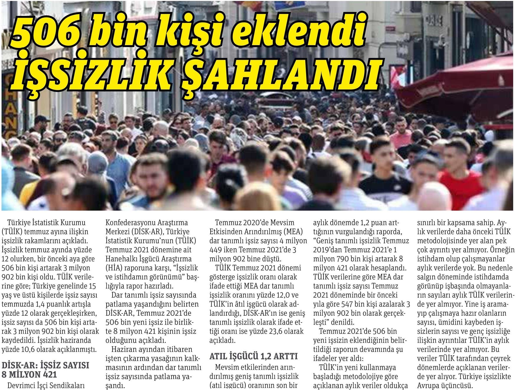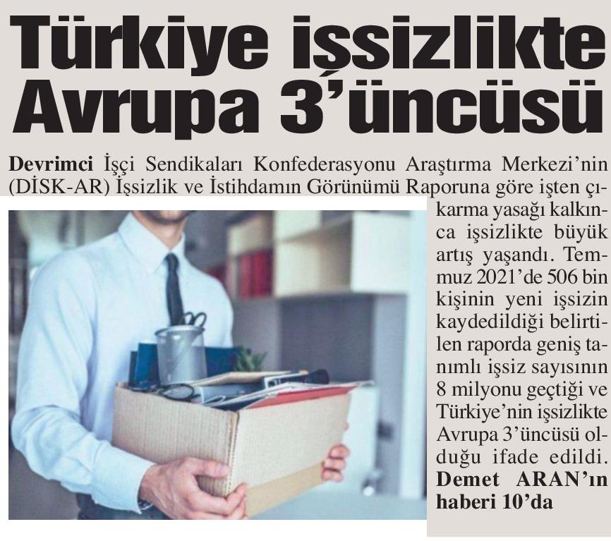 DİSK-AR tarafından hazırlanan ve 10 Eylül 2021’de yayımlanan İşsizlik ve İstihdamın Görünümü Araştırma Bülteni (Eylül 2021) 11 Eylül 2021 tarihli yazılı basında yer verildi.