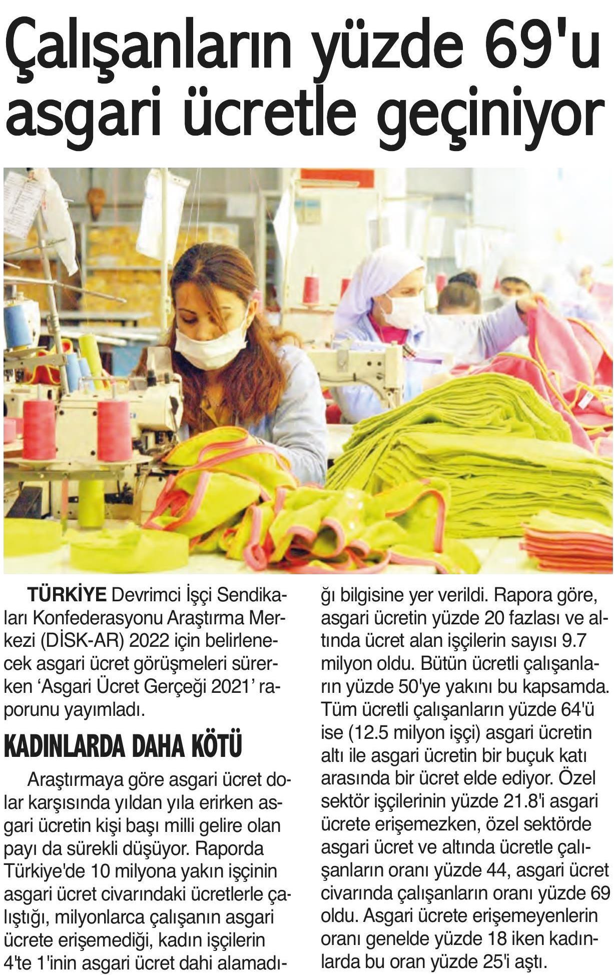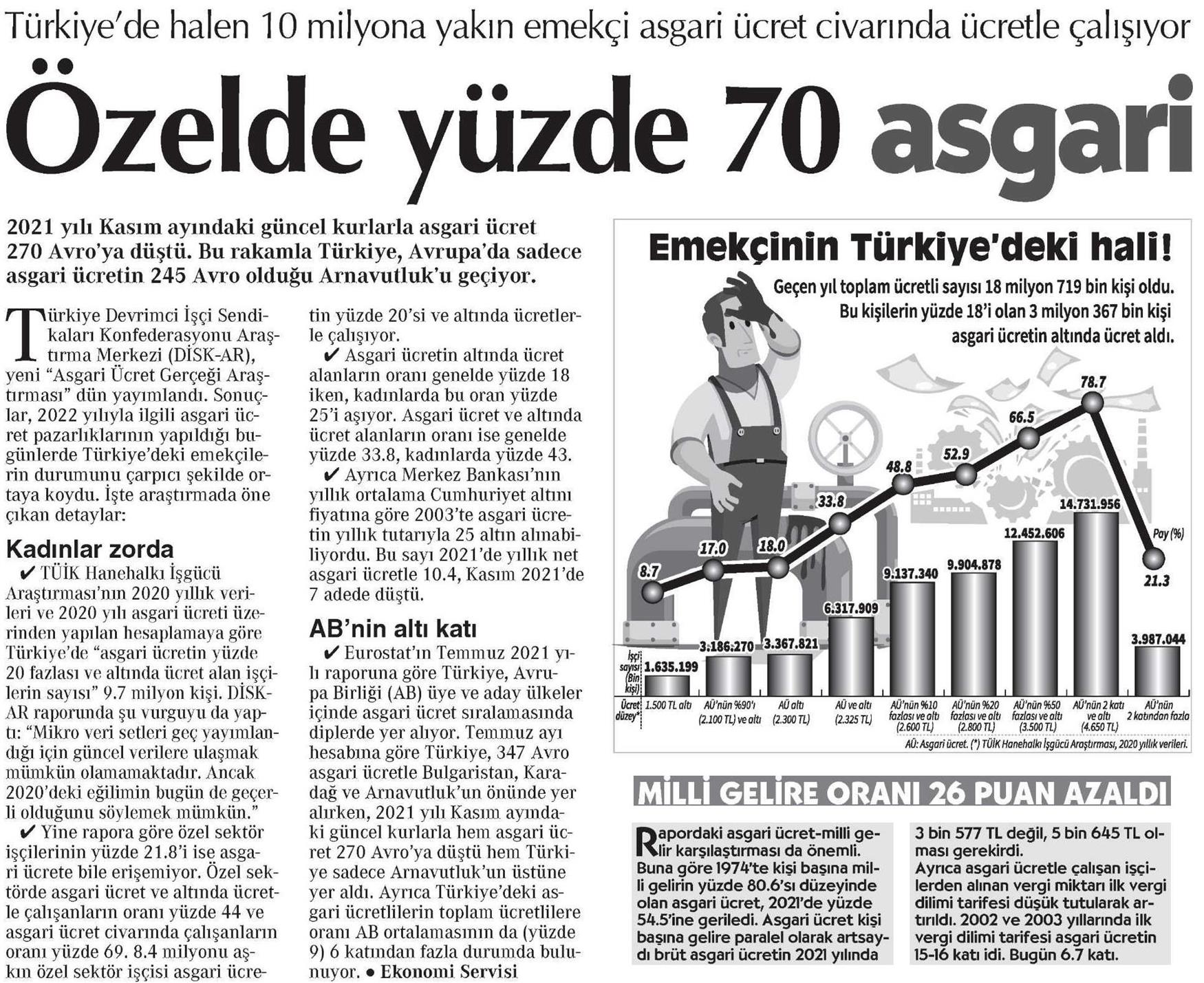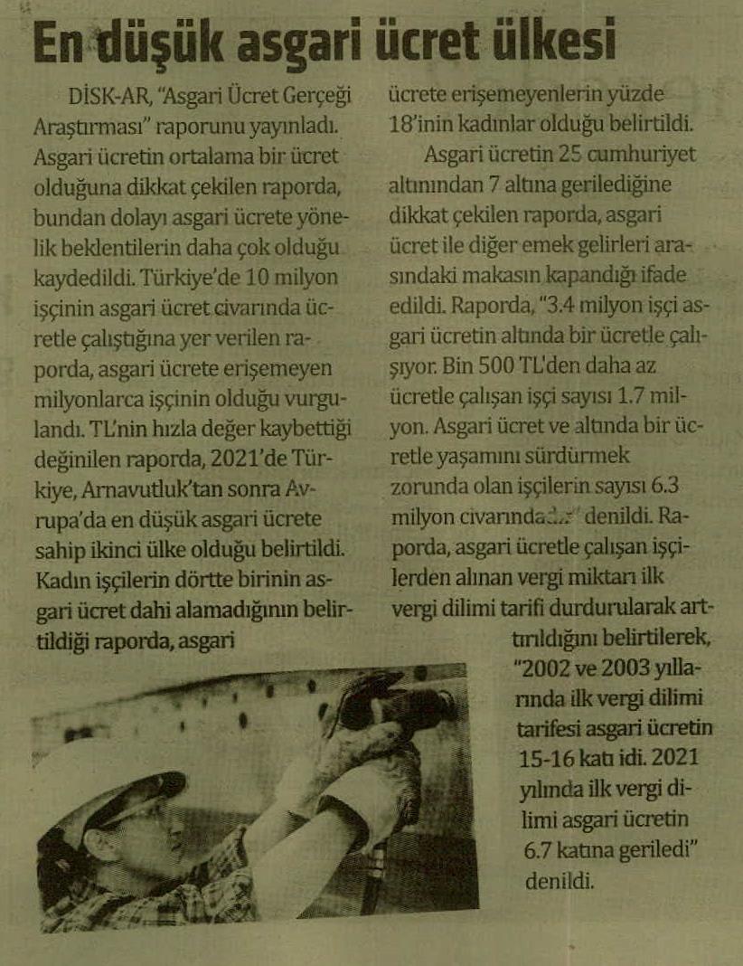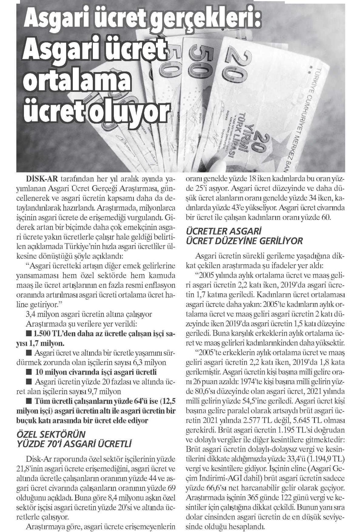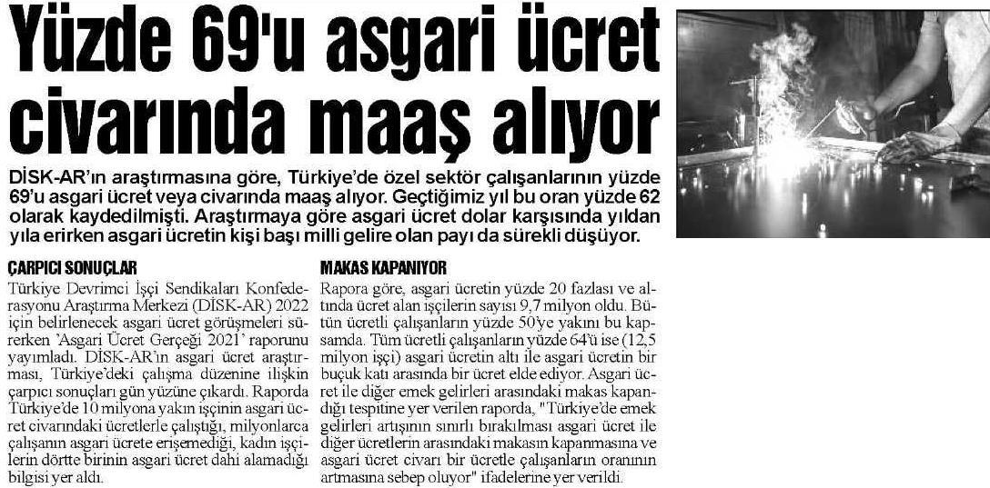DİSK-AR tarafından 2 Aralık 2021 günü yayımlanan “Asgari Ücret Gerçeği-2021” araştırması 3 ve 4 Aralık 2021 tarihli yazılı basında geniş yer buldu.