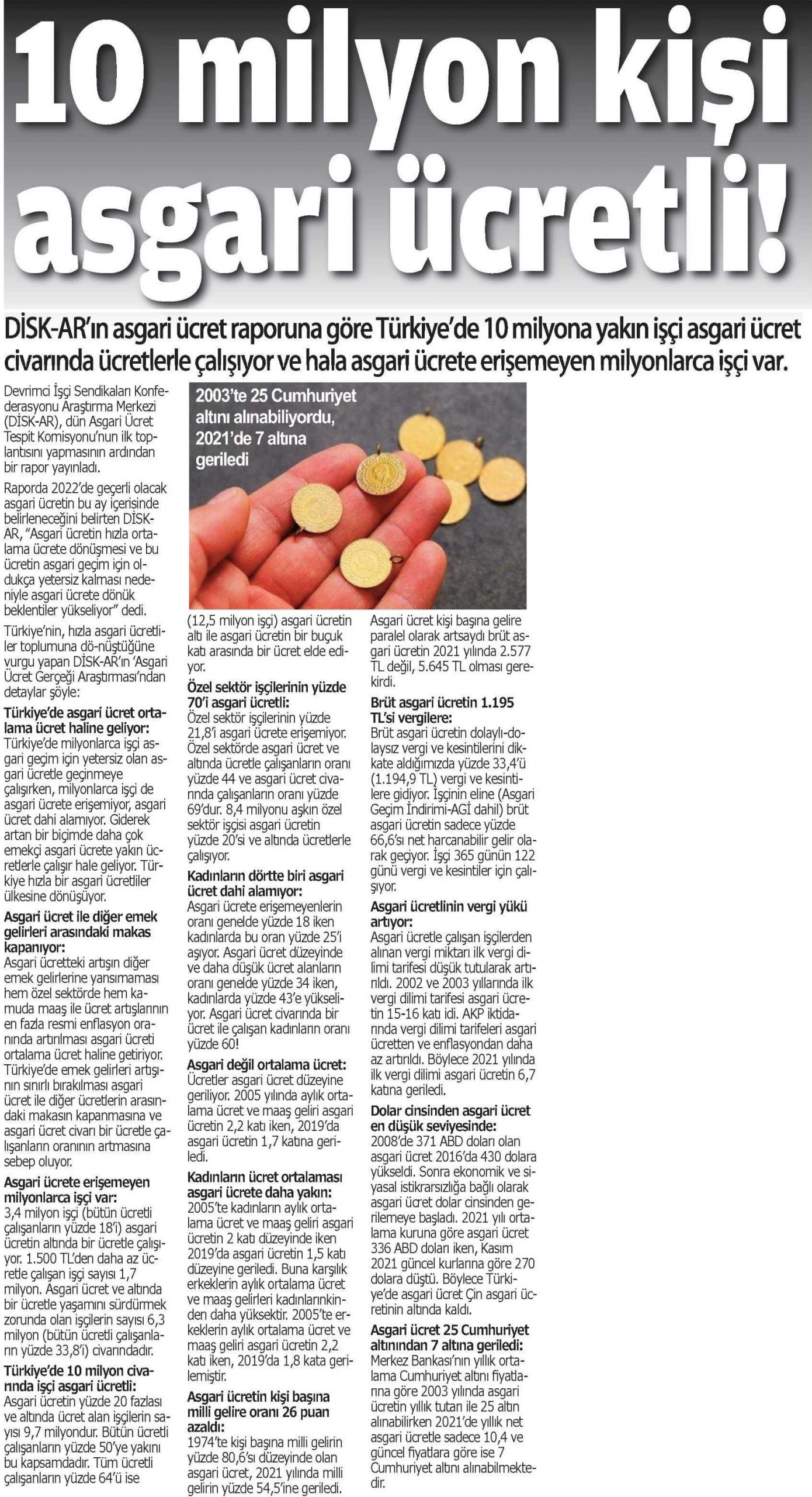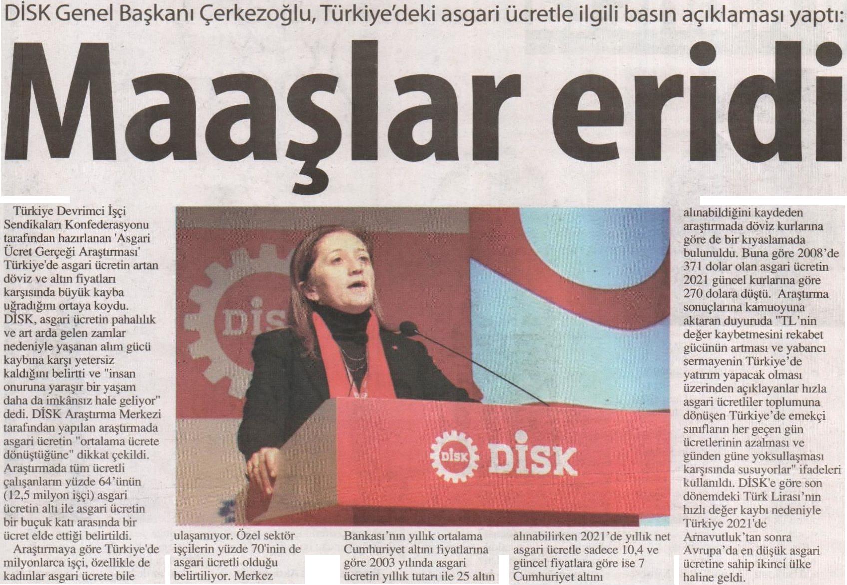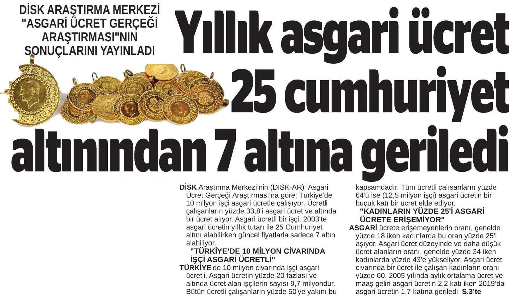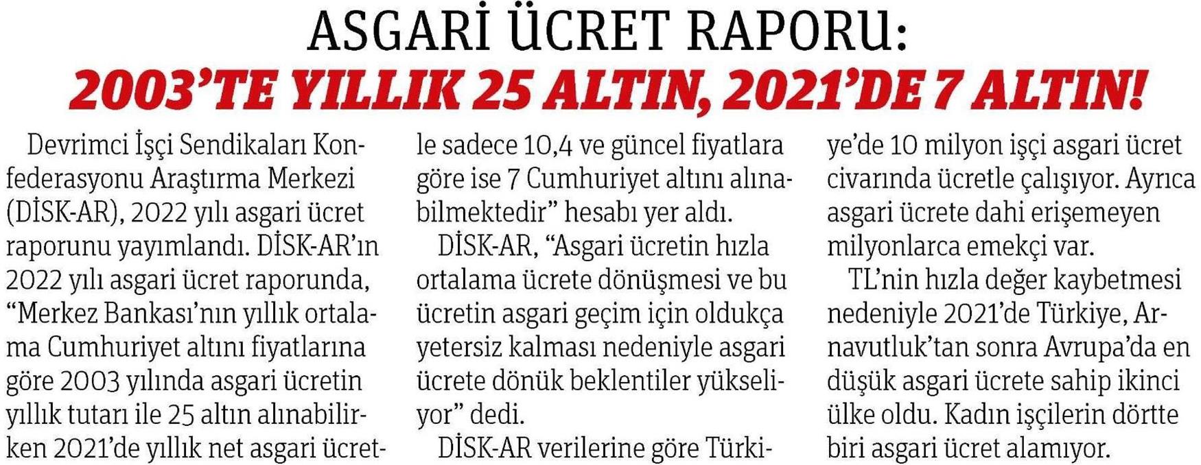 DİSK-AR tarafından 2 Aralık 2021 günü yayımlanan “Asgari Ücret Gerçeği-2021” araştırması 3 ve 4 Aralık 2021 tarihli yazılı basında geniş yer buldu.