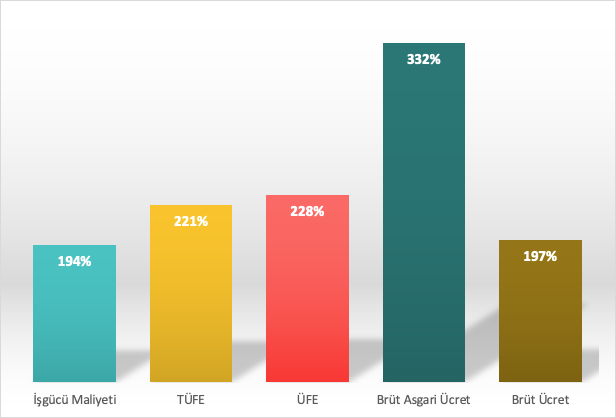 TÜİK, 2020 yılına ait İşgücü Maliyeti istatistiklerini 24 Aralık 2021 tarihinde yayımladı. 2012 yılında 2.053 TL olan brüt ortalama ücret 2020 yılında 4.050 TL olarak açıklandı. 2012 ve 2020 arasındaki 8 yılda tüketici fiyatları yüzde 221 artarken aylık ortalama brüt ücret ise yüzde 197 arttı. Böylece ücretlerdeki artış fiyat artış oranının yaklaşık 25 puan altında kaldı. Diğer bir ifadeyle aylık ortalama brüt ücretler enflasyonun altında kalmış oldu.