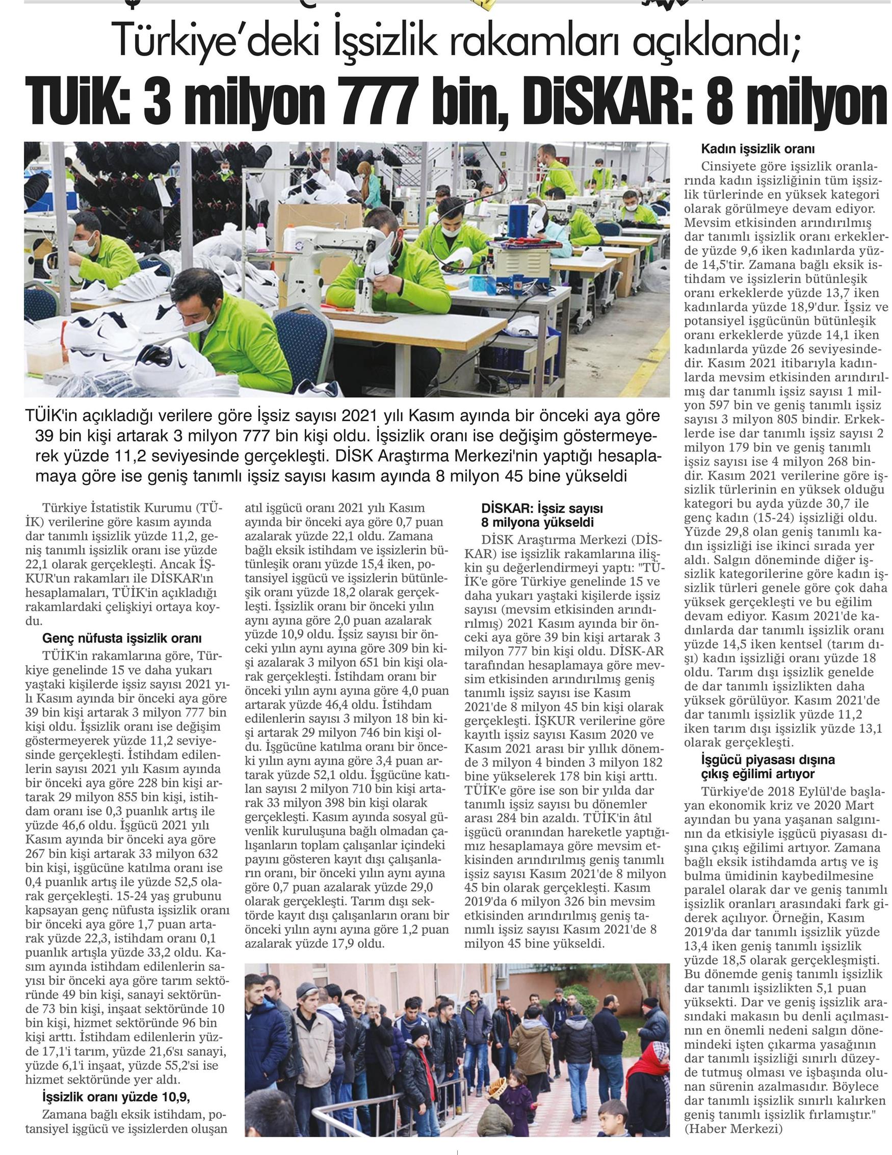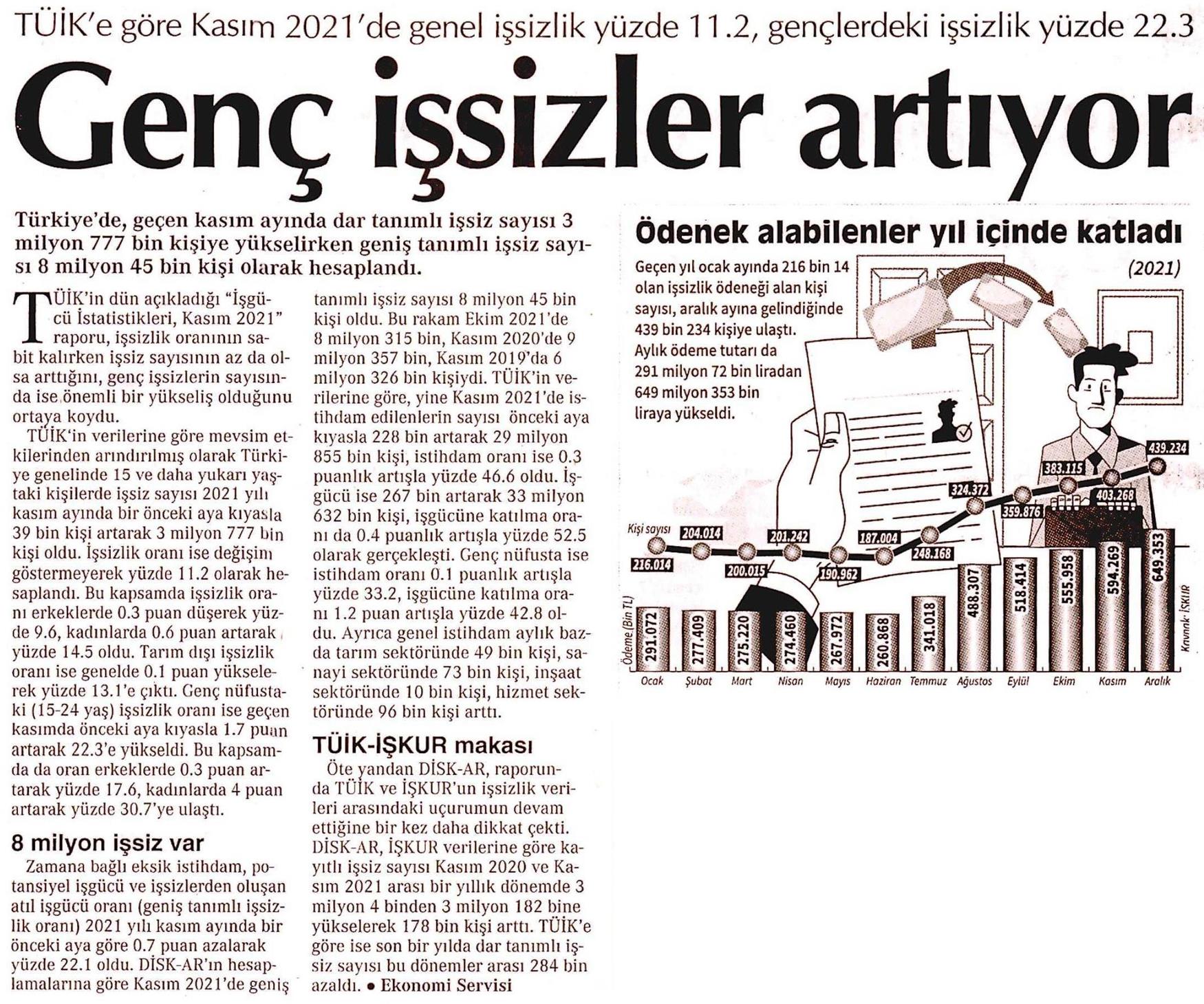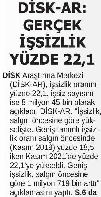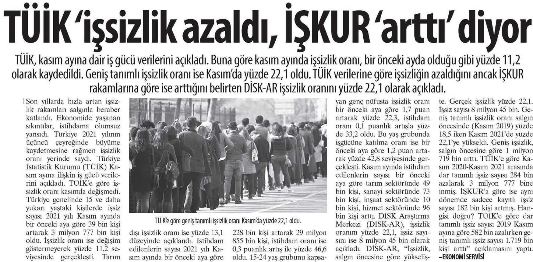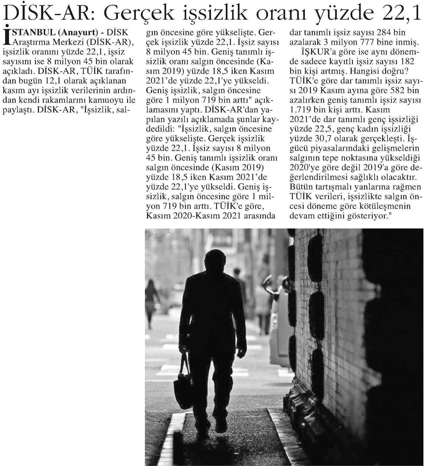 DİSK-AR tarafından 10 Ocak 2022 günü hazırlanan “İşsizlik ve İstihdamın Görünümü Raporu (Ocak 2022)“, 11 Ocak 2022 tarihli yazılı basında geniş yer buldu.