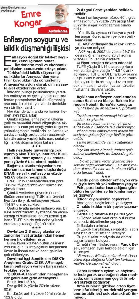 Emre Kongar-Enflasyon soygunu ve laiklik düşmanlığı ilişkisi 5 Nisan 2022 Emre Kongar, 5 Nisan 2022 tarihli Cumhuriyet‘te yayımlanan “Enflasyon soygunu ve laiklik düşmanlığı ilişkisi” adlı yazısında DİSK-AR’ın 4 Haziran 2022’de yayımladığı dar gelirlilerde enflasyon hesaplamasına yer verdi. Cumhuriyet, 5 Nisan 2022.