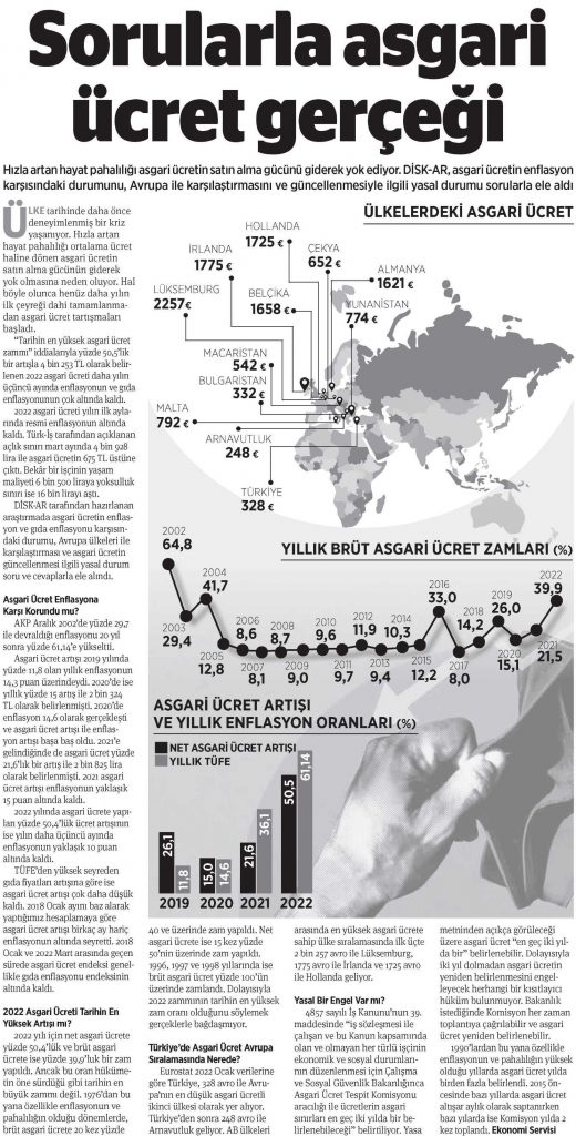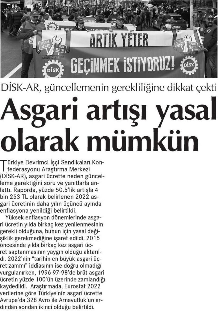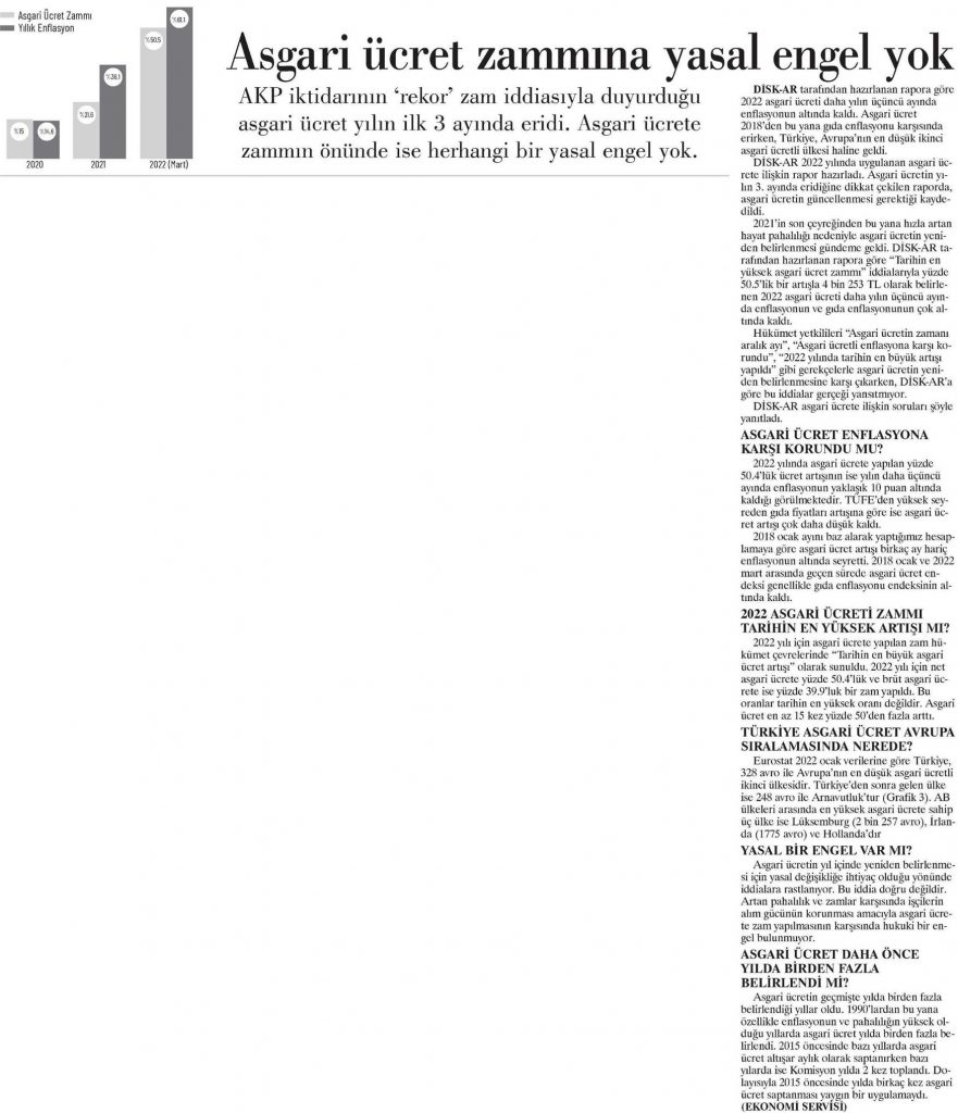 DİSK-AR tarafından hazırlanan ve 12 Nisan 2022’de yayımlanan “Soru ve yanıtlarla asgari ücret neden güncellenmeli?” isimli araştırma bülteni, 13 Nisan 2022 tarihli BirGün, Cumhuriyet ve Evrensel gazetelerinde yer aldı.