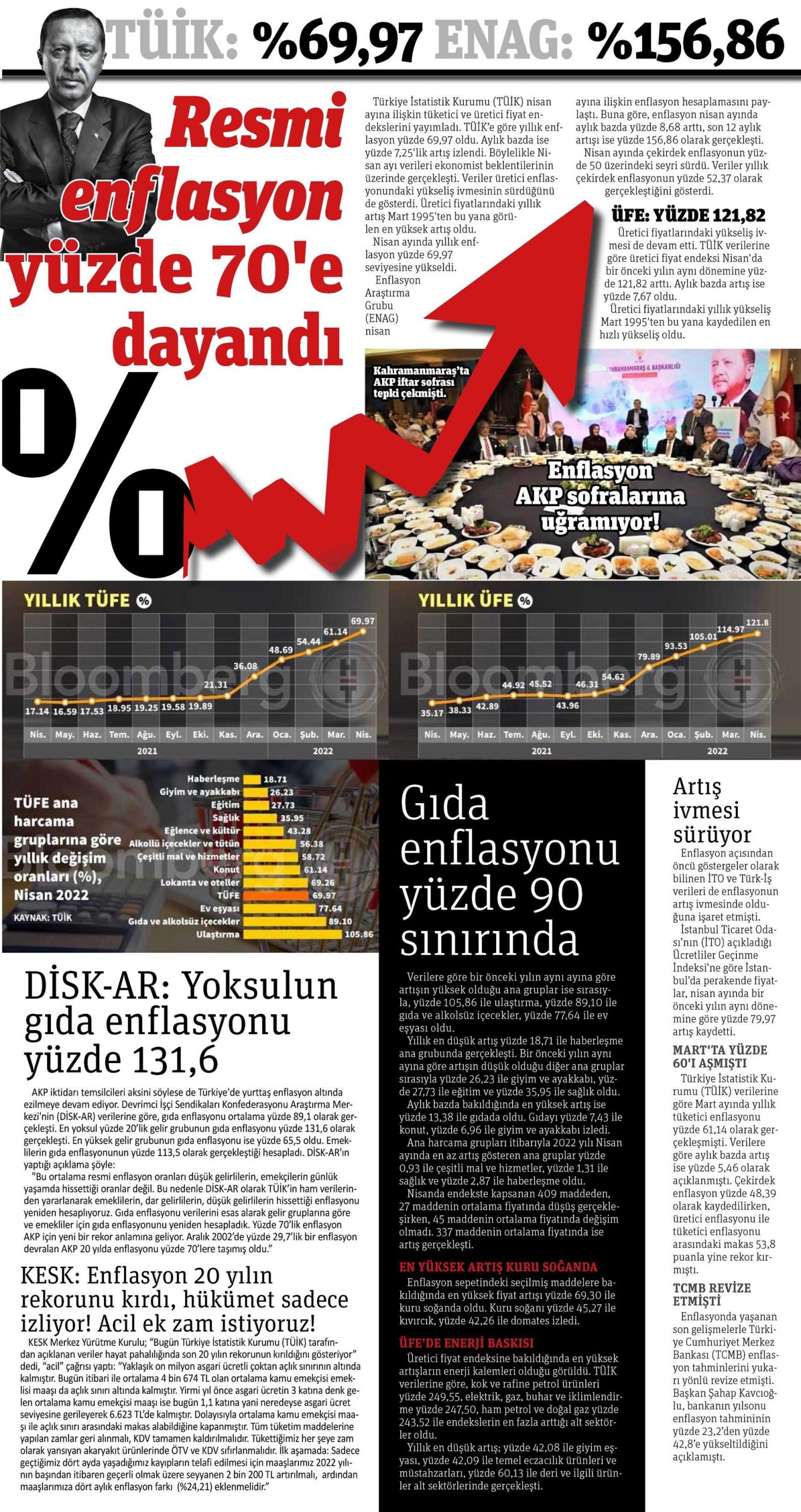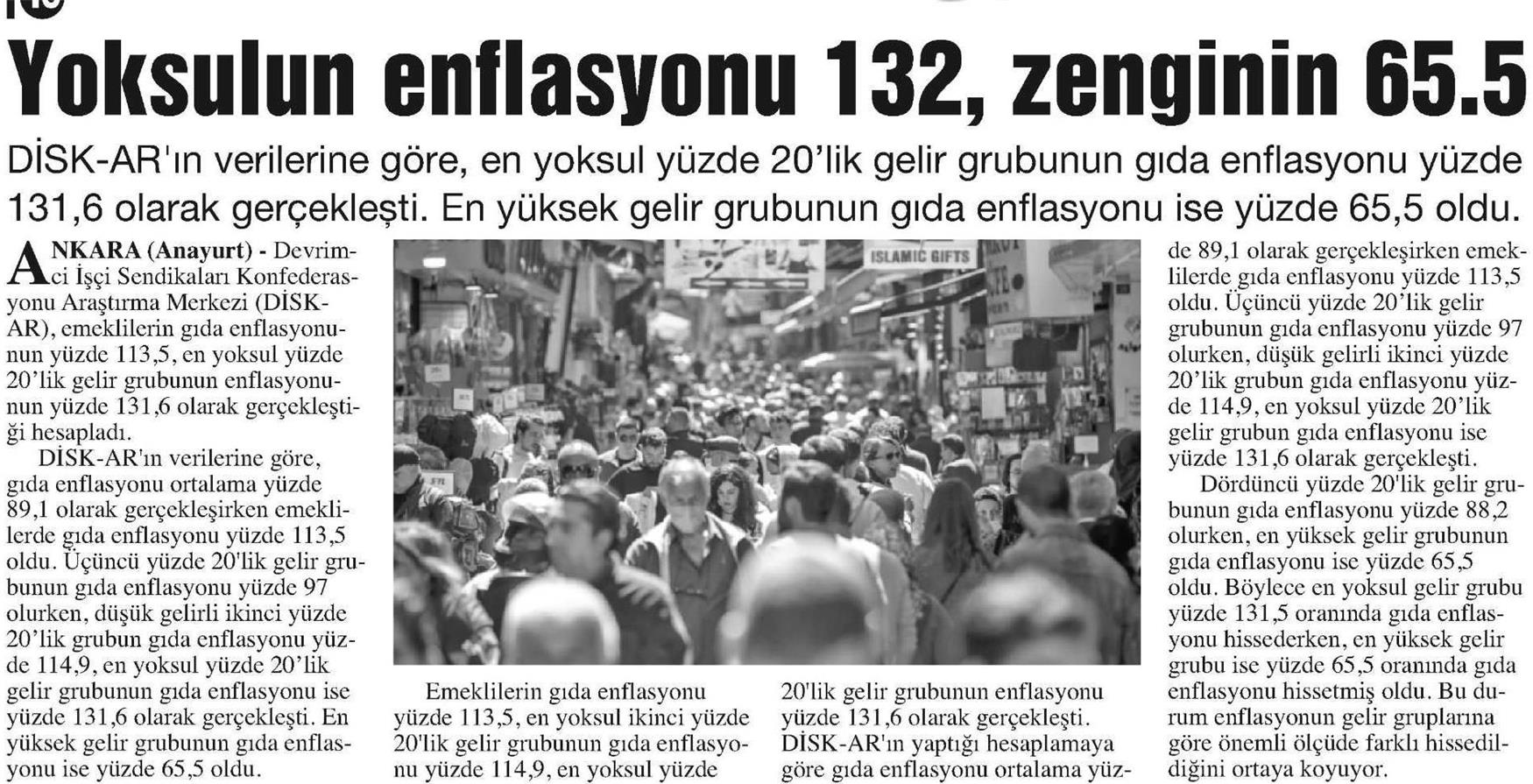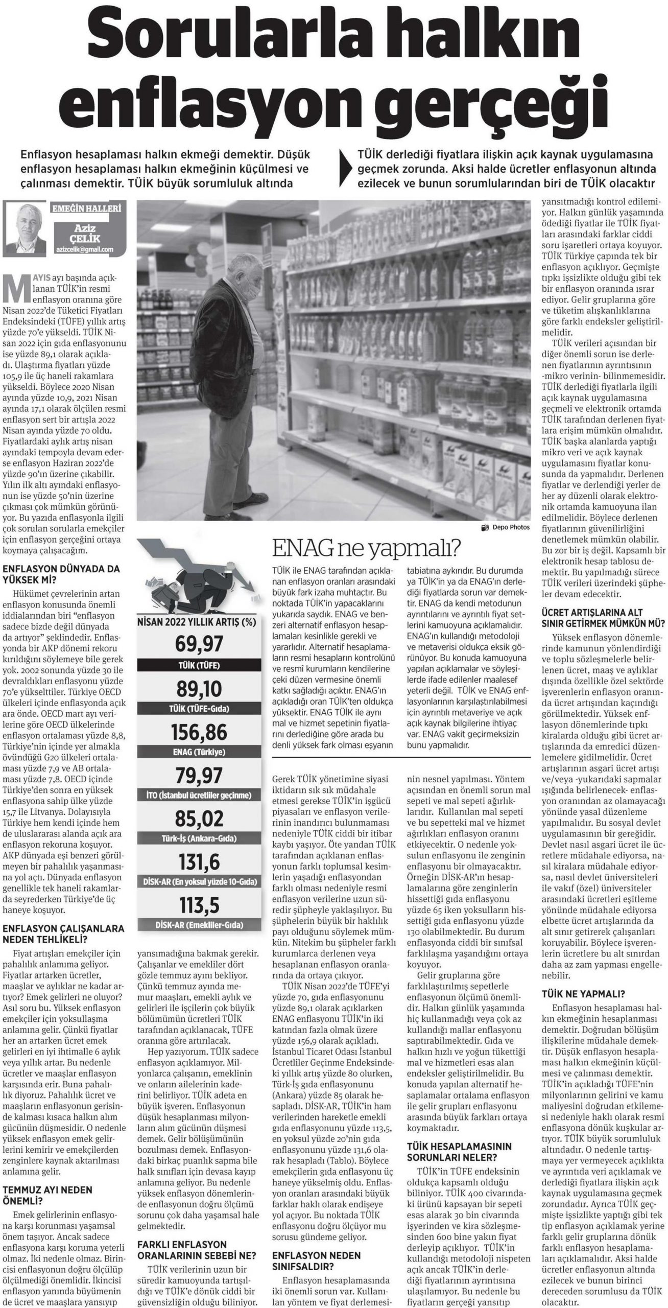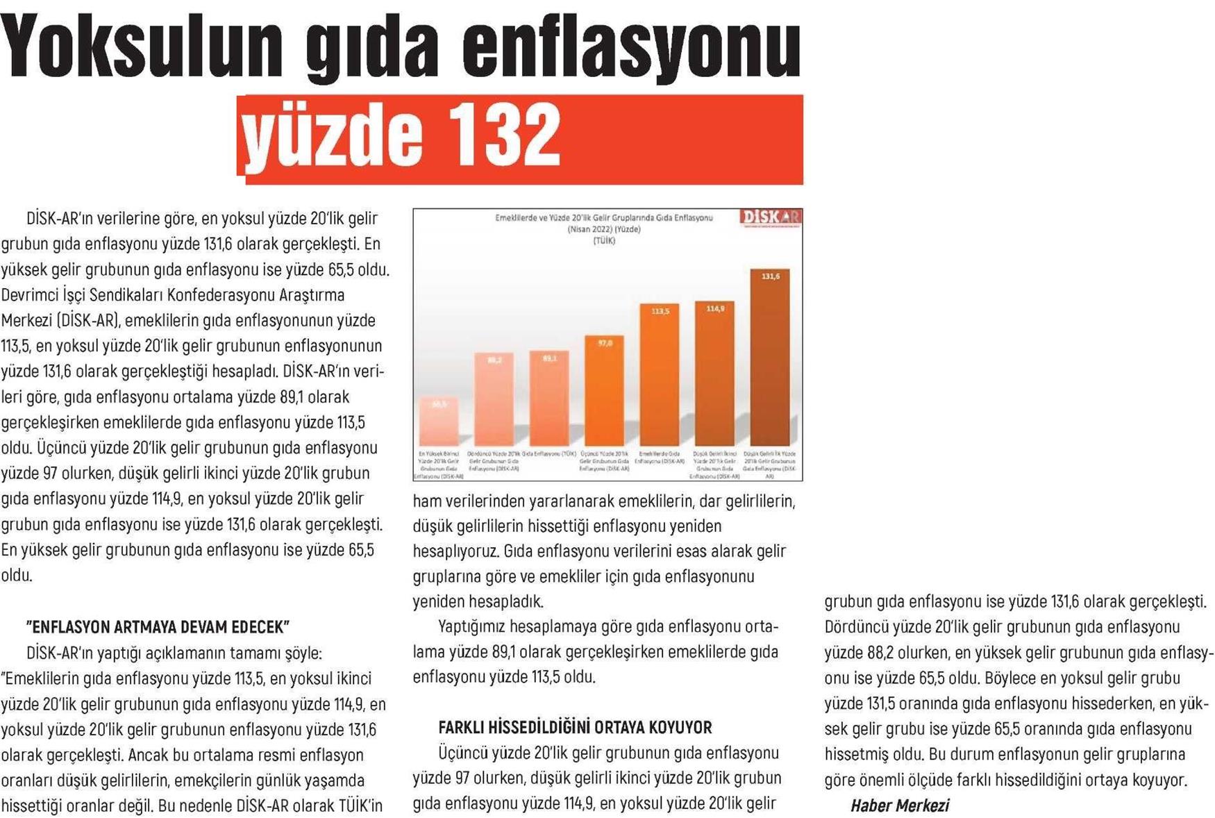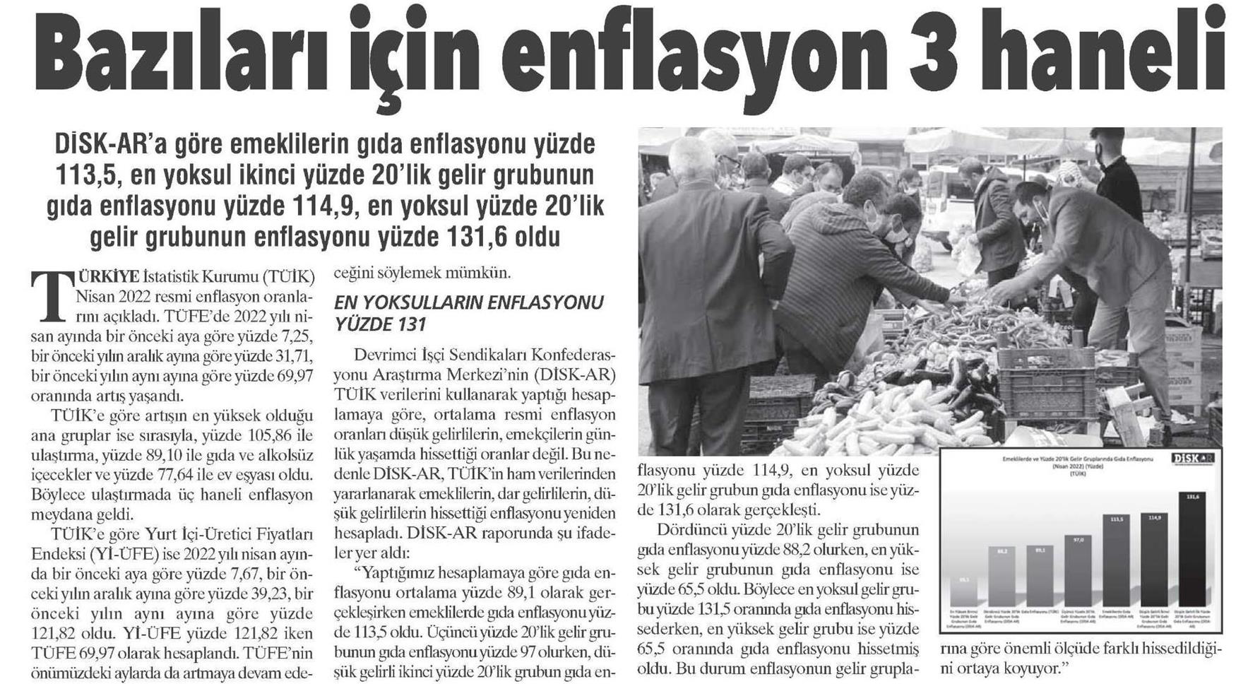 DİSK-AR tarafından hazırlanan ve 5 Mayıs 2022 günü yayımlanan “Emekçinin Enflasyonu Üç Haneli” adlı haber bülteni 6 ve 7 Mayıs 2022 tarihli yazılı basında geniş yer buldu.