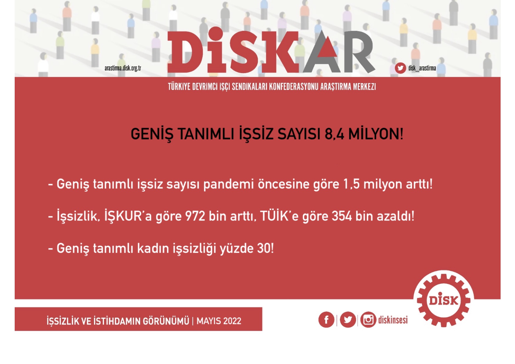 DİSK-AR tarafından TÜİK verilerinden yararlanarak yapılan hesaplamaya göre mevsim etkisinden arındırılmış geniş tanımlı işsiz sayısı ise Mart 2022’de 8 milyon 356 bin kişi olarak gerçekleşti. Pandemi öncesine göre işsiz sayısı 1 milyon 536 bin arttı. TÜİK’e göre Mart 2019’da yüzde 13,9 olan işsizlik Mart 2022’de yüzde 11,5’e düştü. Ancak geniş tanımlı işsizlik yüzde 19,7’den yüzde 22,7’ye yükseldi.