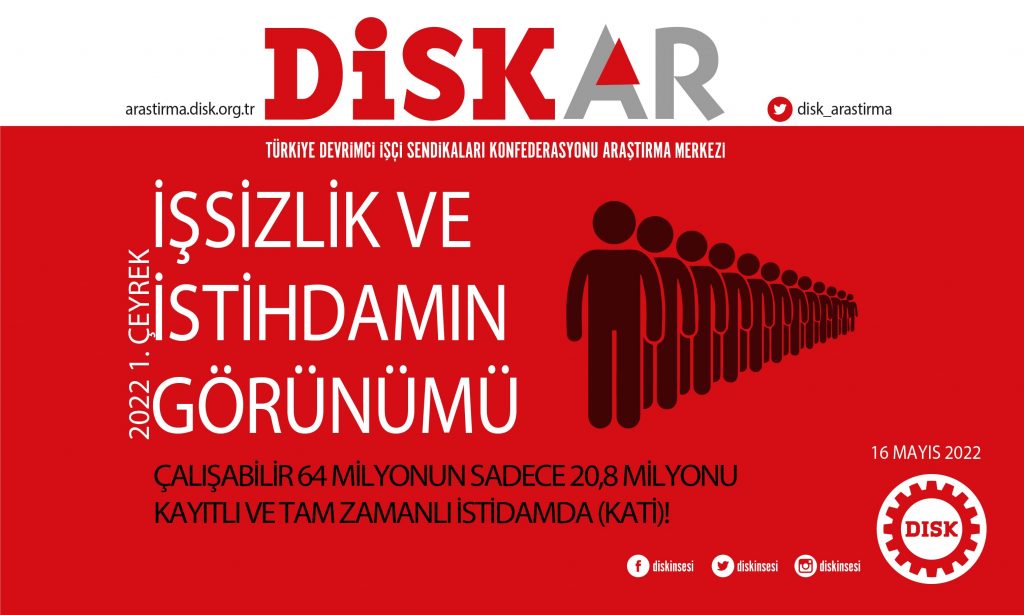 TÜİK’in resmi istihdam oranı 2022 1. çeyrekte yüzde 46,6 olarak açıklanırken, DİSK-AR tarafından TÜİK verilerinden hareketle hesaplanan Kayıtlı Tam Zamanlı İstihdam (KATİ) oranı yüzde 32,5 olarak gerçekleşti. Kadınlarda resmi istihdam oranı yüzde 29,5 olarak açıklanmışken KATİ oranı yüzde 18,1 ve erkeklerde resmi istihdam oranı yüzde 64 olarak açıklanmışken KATİ oranı yüzde 47,1 olarak hesaplandı.