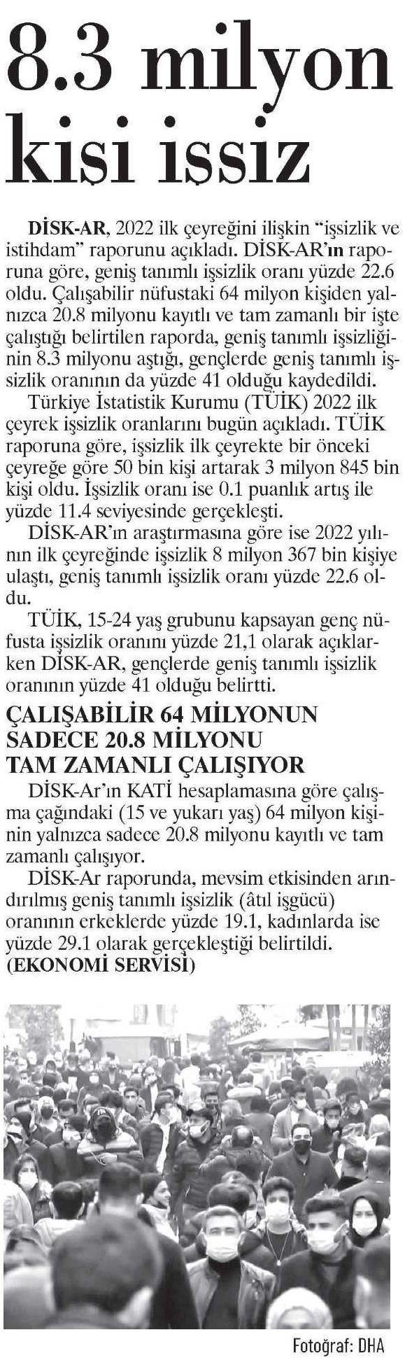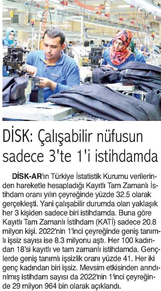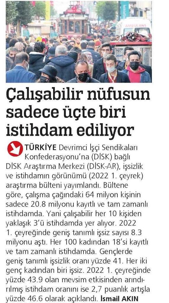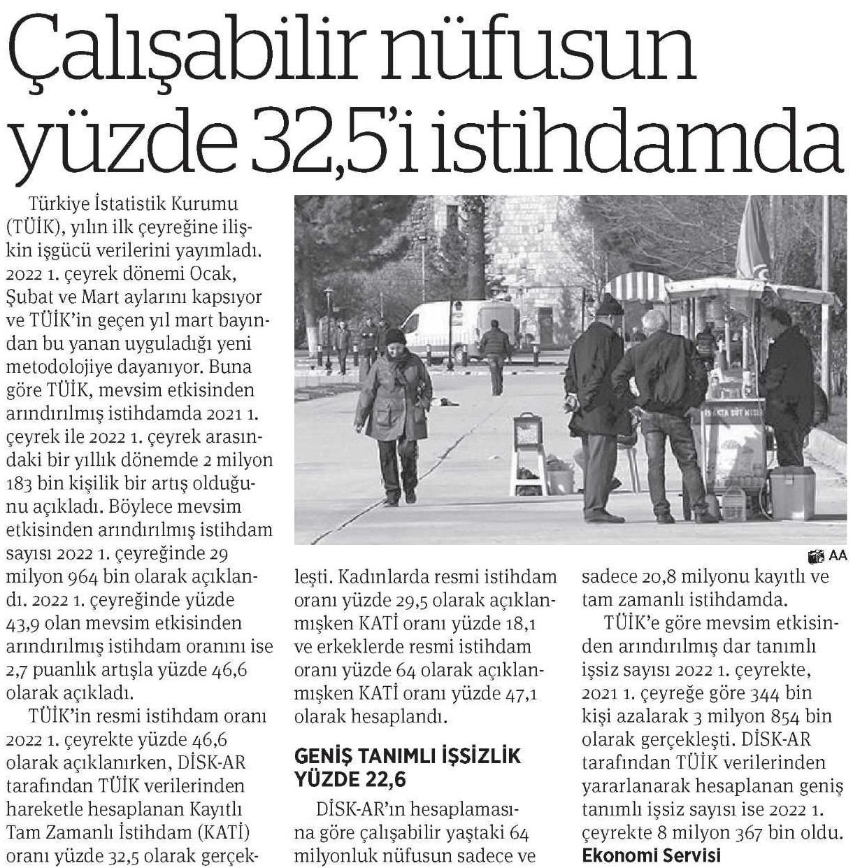DİSK-AR tarafından hazırlanan ve 16 Mayıs 2022 günü yayımlanan 2022 1. Çeyrek döneminde Ocak, Şubat ve Mart aylarını kapsayan “İşsizlik ve İstihdamın Görünümü Raporu (Mayıs 2022- 1. Çeyrek)” 17 Mayıs 2022 tarihli yazılı basında yer buldu.