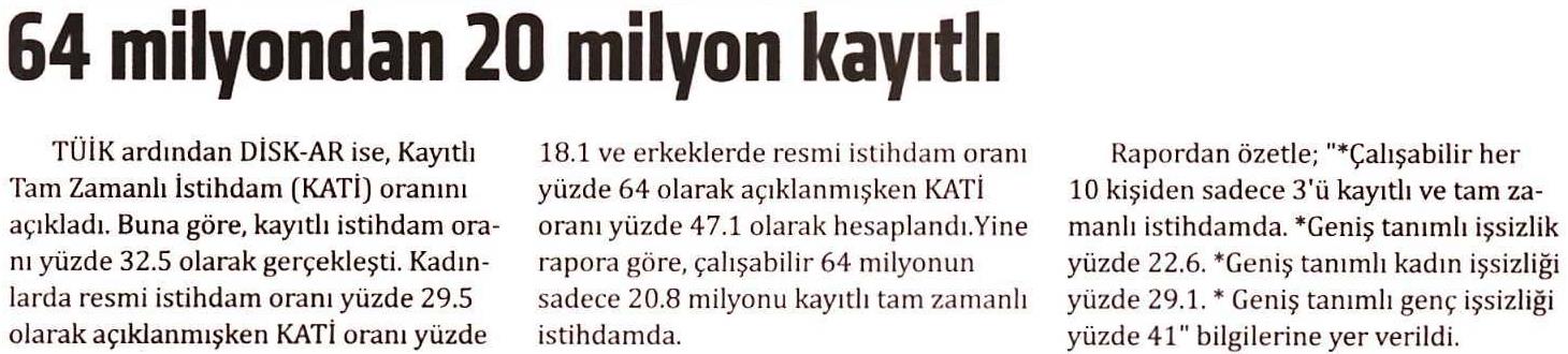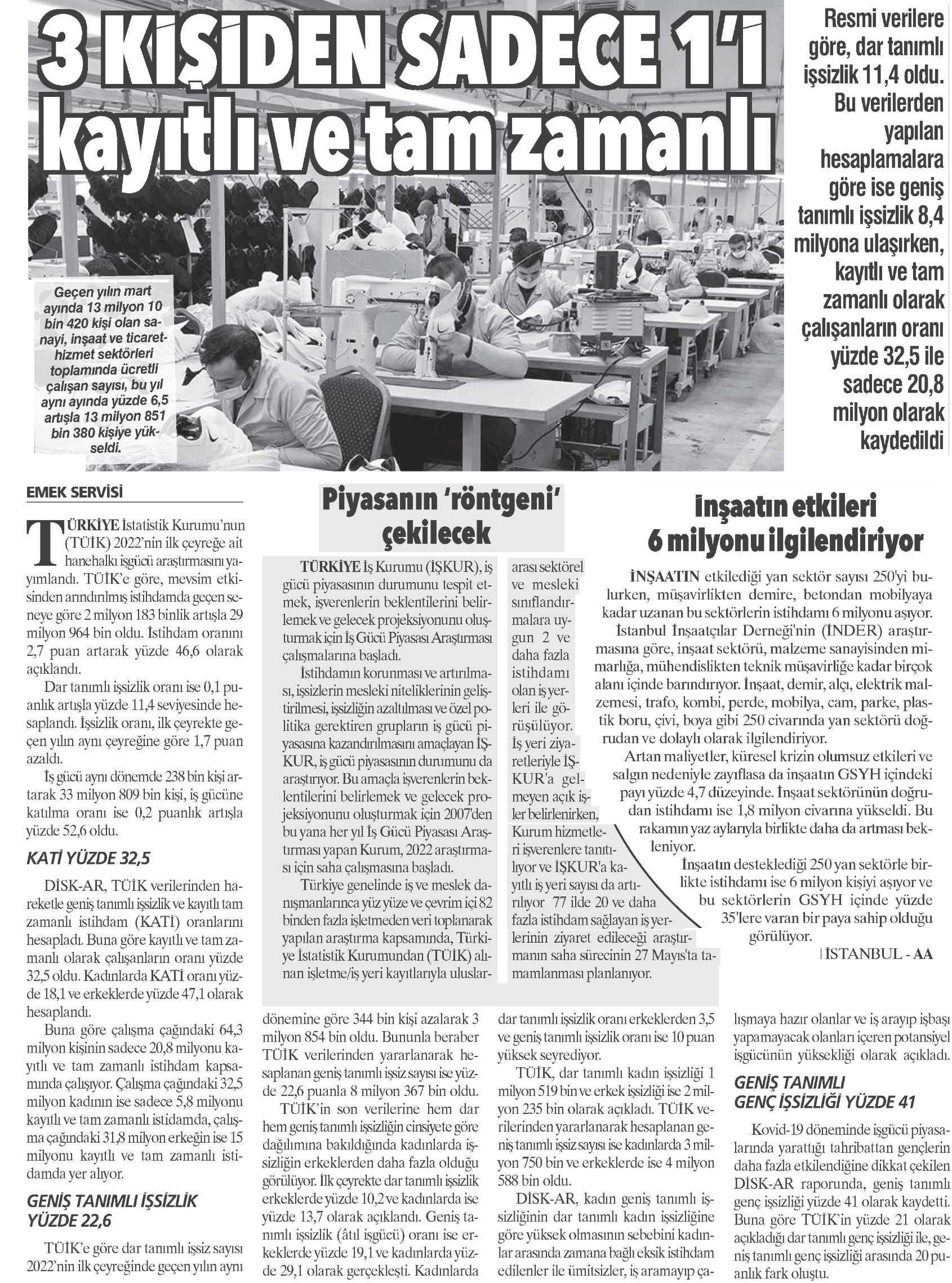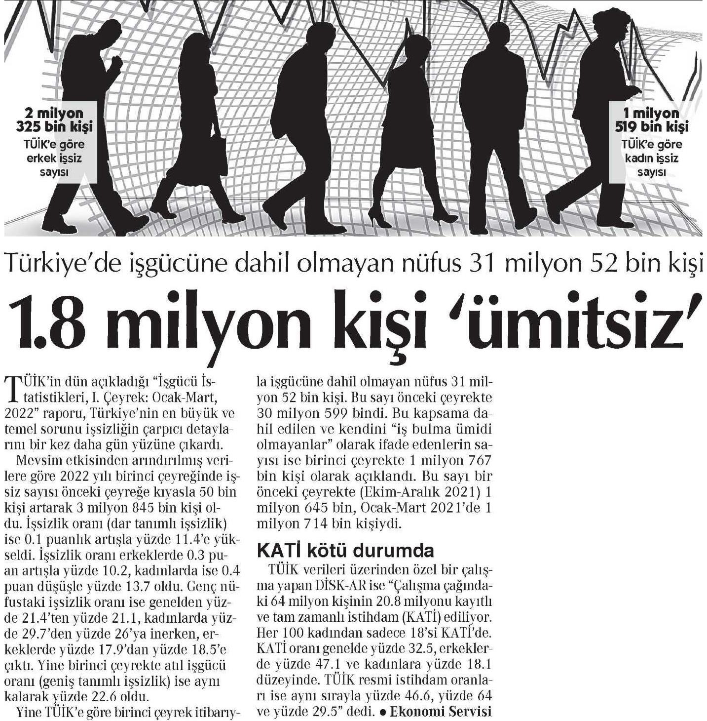 DİSK-AR tarafından hazırlanan ve 16 Mayıs 2022 günü yayımlanan 2022 1. Çeyrek döneminde Ocak, Şubat ve Mart aylarını kapsayan “İşsizlik ve İstihdamın Görünümü Raporu (Mayıs 2022- 1. Çeyrek)” 17 Mayıs 2022 tarihli yazılı basında yer buldu.