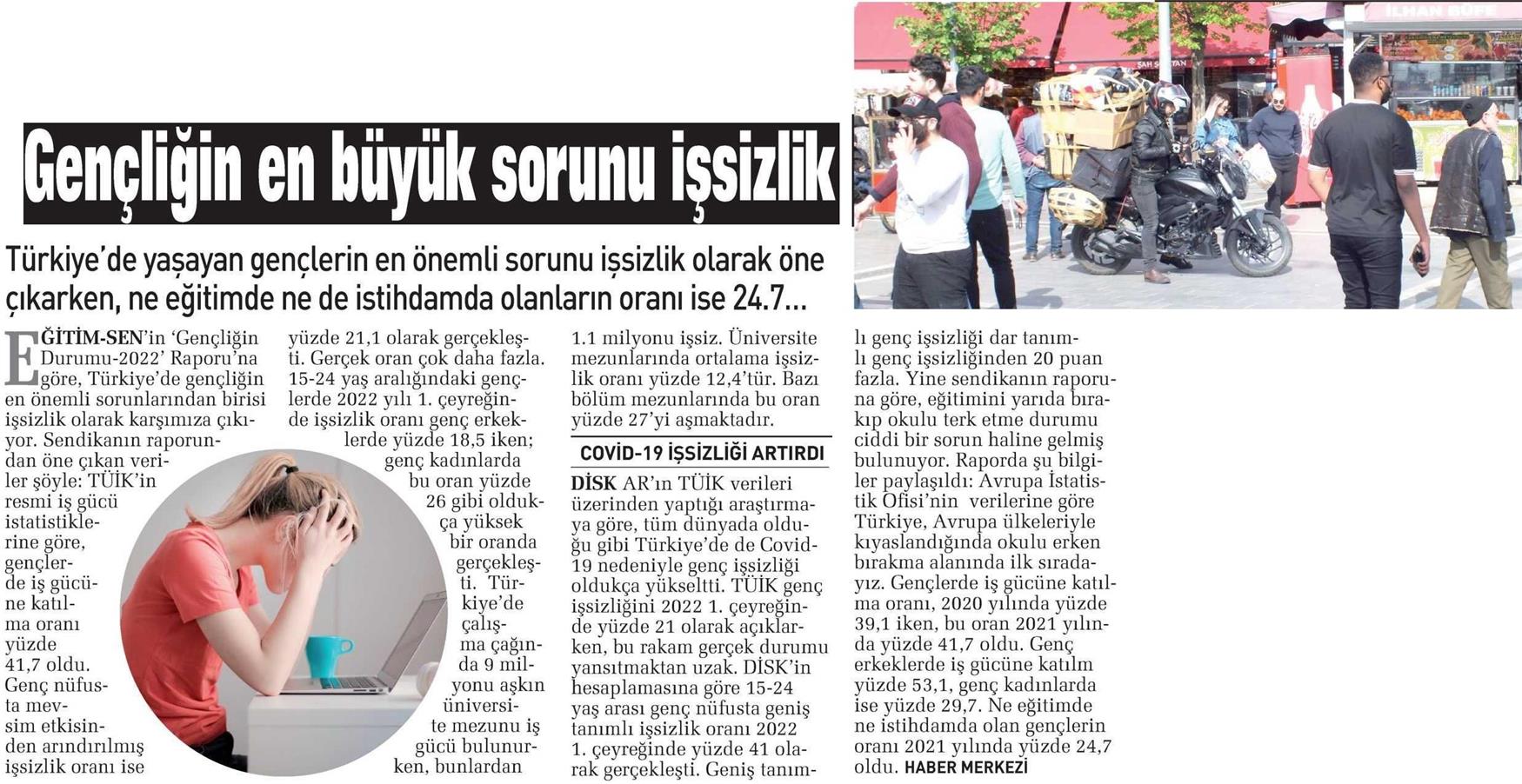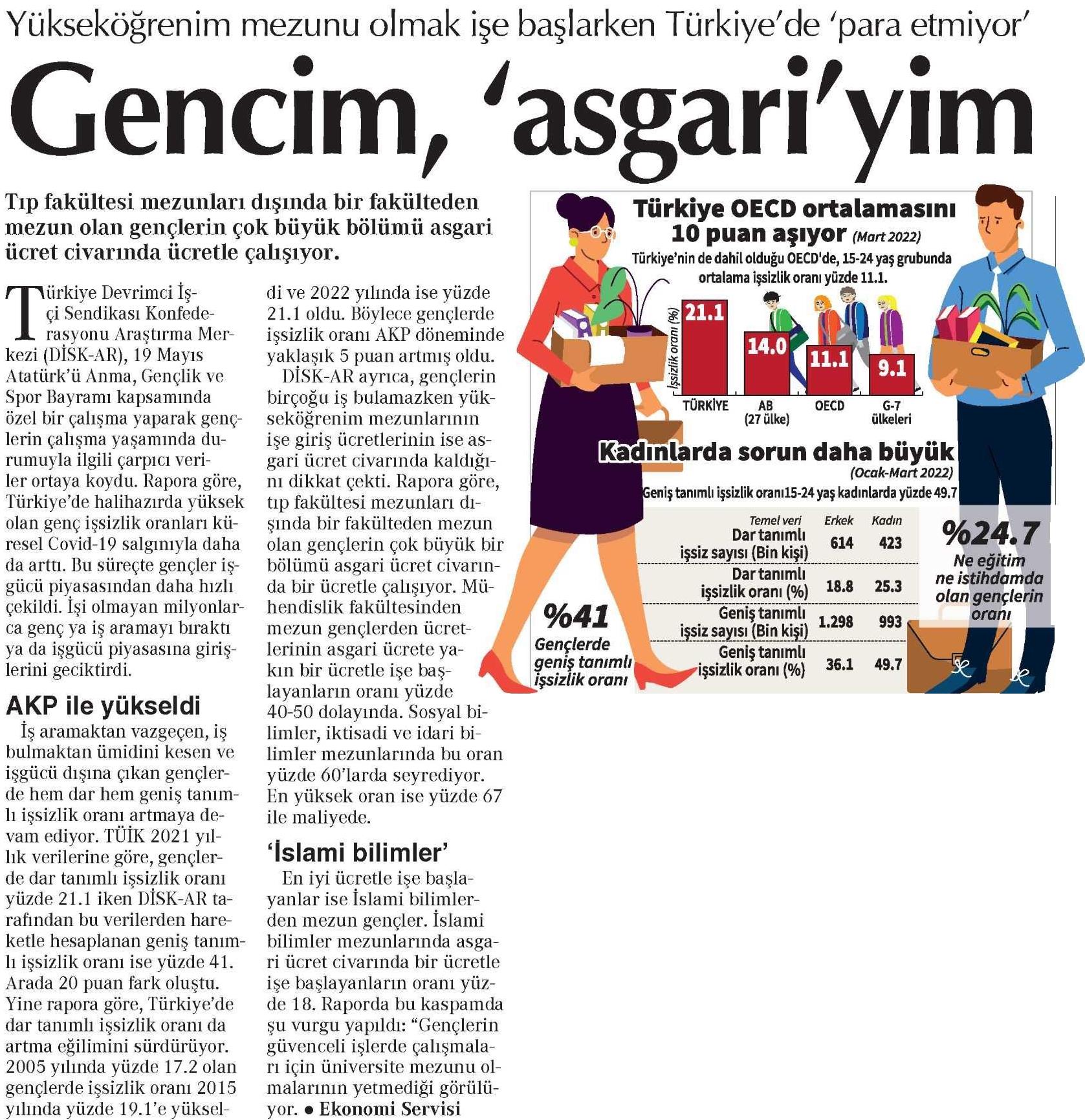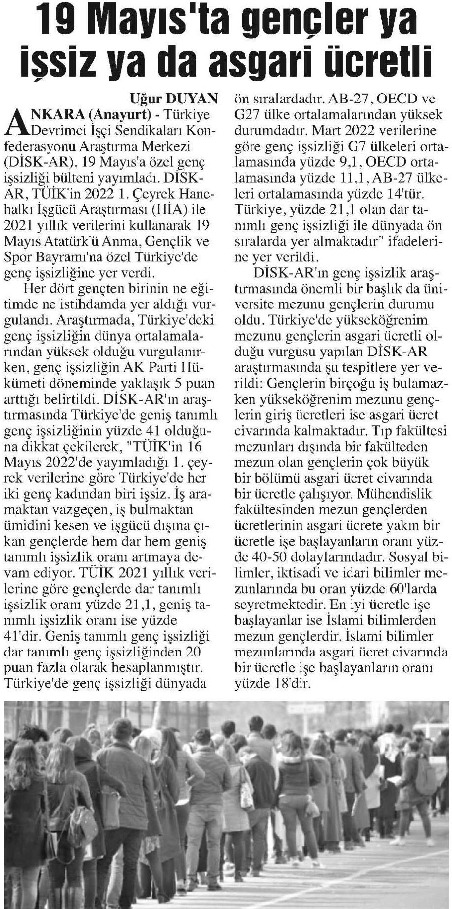 DİSK-AR tarafından hazırlanan ve 18 Mayıs 2022 günü yayımlanan “19 Mayıs’ta Gençler Ya İşsiz Ya Asgari Ücretli” adlı araştırma bülteni 19 Mayıs 2022 tarihli yazılı basında yer buldu.