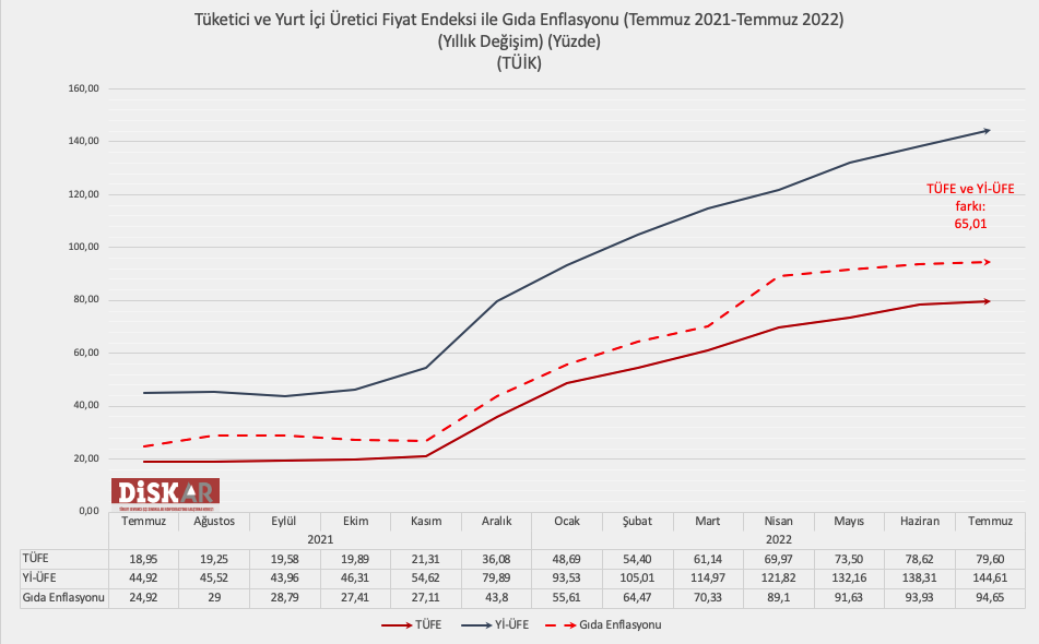 TÜİK’e göre Yurt İçi-Üretici Fiyatları Endeksi (Yİ-ÜFE) (2003=100) ise 2022 Temmuz ayında bir önceki aya göre yüzde 5,17, bir önceki yılın aralık ayına göre yüzde 70,04 ve bir önceki yılın aynı ayına göre yüzde 144,61 olarak gerçekleşti.