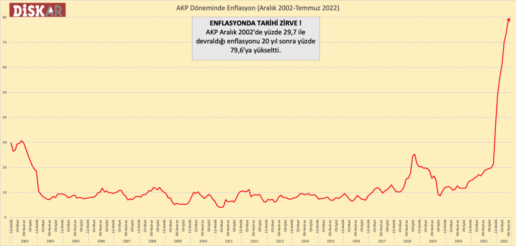 Öte yandan yüzde 79,6 olan resmi enflasyon oranı AKP dönemi için yeni bir rekor anlamına geliyor. Aralık 2002’de yüzde 29,7’lik bir enflasyon devralan AKP 20 yılda enflasyonu 50 puan artırmış oldu.