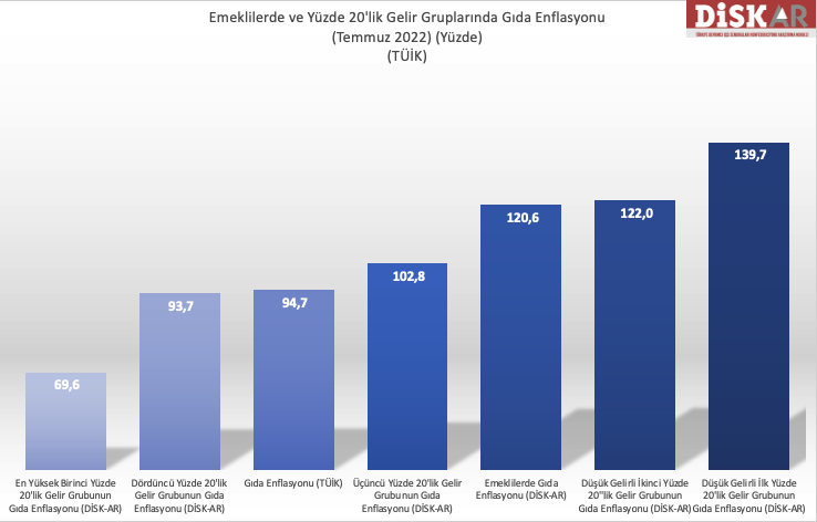 Dördüncü yüzde 20’lik gelir grubunun gıda enflasyonu yüzde 93,7 olurken, en yüksek gelir grubunun gıda enflasyonu ise yüzde 69,6 oldu. Böylece en yoksul gelir grubu yüzde 140 oranında gıda enflasyonu hissederken, en yüksek gelir grubu ise yüzde 70 oranında gıda enflasyonu hissetmiş oldu. Bu durum enflasyonun gelir gruplarına göre önemli ölçüde farklı hissedildiğini ortaya koyuyor.