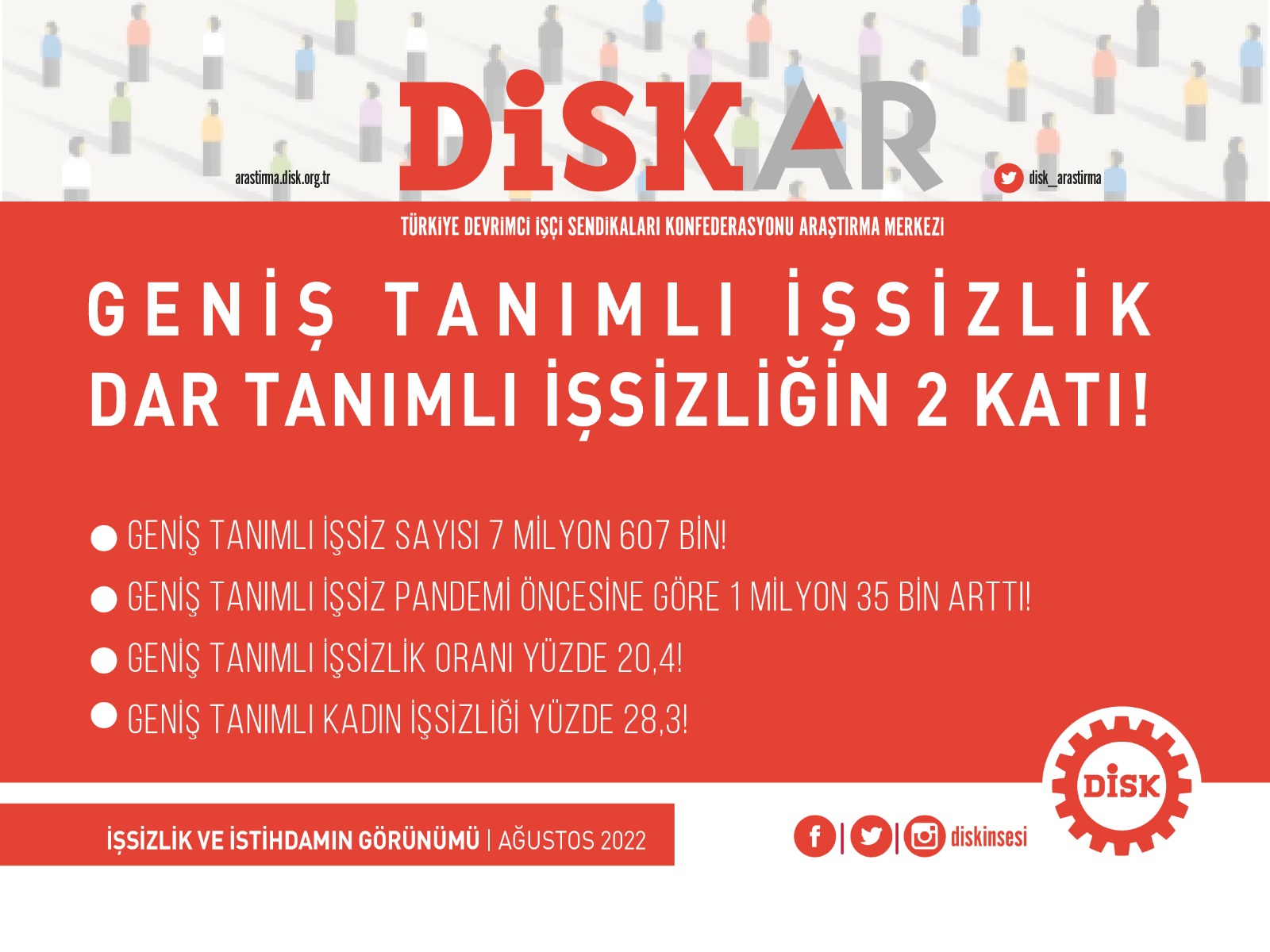 TÜİK’in Haziran 2022 Hanehalkı İşgücü Araştırması (HİA) sonuçları 10 Ağustos 2022’de yayımlandı. Mevsim etkisinden arındırılmış dar tanımlı işsizlik oranı yüzde 10,3, mevsim etkisinden arındırılmış geniş tanımlı işsizlik oranı (âtıl işgücü) ise yüzde 20,4 seviyesinde gerçekleşti. TÜİK’e göre Türkiye genelinde 15 ve daha yukarı yaştaki kişilerde işsiz sayısı (mevsim etkisinden arındırılmış) 2022 Haziran ayında bir önceki aya göre 136 bin kişi azalarak 3 milyon 541 bin kişi oldu. DİSK-AR tarafından TÜİK verilerinden yararlanarak yapılan hesaplamaya göre mevsim etkisinden arındırılmış geniş tanımlı işsiz sayısı iseHaziran 2022’de 7 milyon 607 bin kişi olarak gerçekleşti. TÜİK’e göre Haziran 2019’da yüzde 13,7 olan işsizlik Haziran 2022’de yüzde 13,5 olarak gerçekleşti. Ancak aynı yıllarda geniş tanımlı işsizlik yüzde 19,1’den yüzde 20,4’e yükseldi