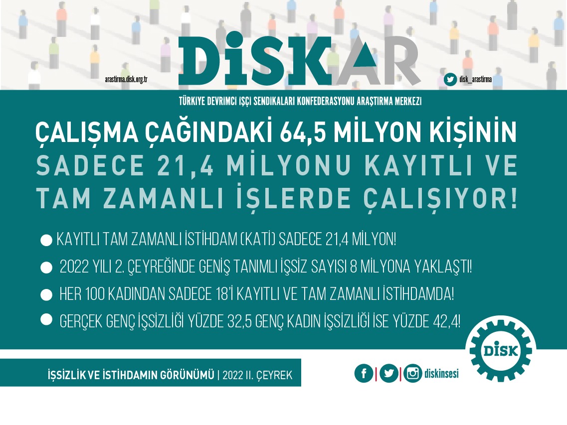 TÜİK’in resmi istihdam oranı 2022 1. çeyrekte yüzde 47,7 olarak açıklanırken, DİSK-AR tarafından TÜİK verilerinden hareketle hesaplanan Kayıtlı Tam Zamanlı İstihdam (KATİ) oranı yüzde 33,3 olarak gerçekleşti. Kadınlarda resmi istihdam oranı yüzde 30,4 iken KATİ oranı yüzde 18,4 ve erkeklerde resmi istihdam oranı yüzde 65,3 olarak açıklanmışken KATİ oranı yüzde 48,5 olarak hesaplandı.
