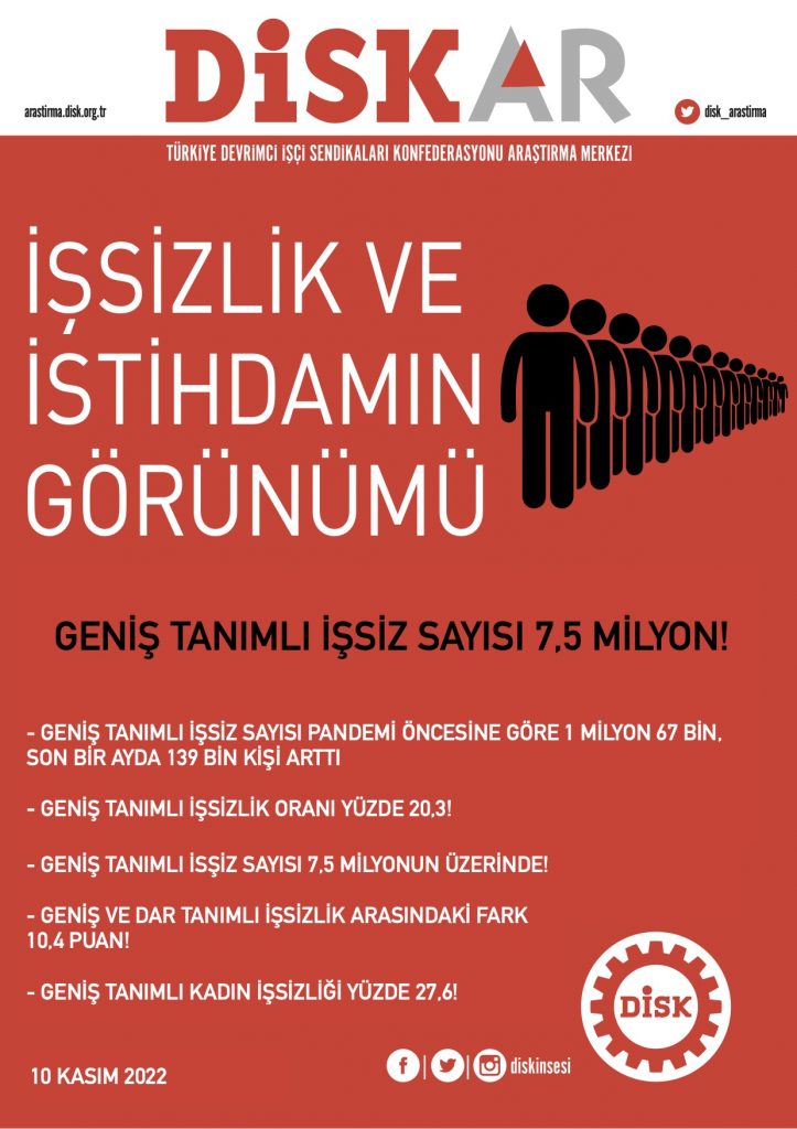 DİSK-AR tarafından TÜİK verilerinden yararlanarak yapılan hesaplamaya göre mevsim etkisinden arındırılmış geniş tanımlı işsiz sayısı ise Eylül 2022’de 7 milyon 515 bin kişi olarak gerçekleşti. TÜİK’e göre Eylül 2019’da yüzde 14,1 olan işsizlik Eylül 2022’de yüzde 10,1 olarak gerçekleşti. Ancak aynı yıllarda geniş tanımlı işsizlik yüzde 19’dan yüzde 20,3’e yükseldi.
