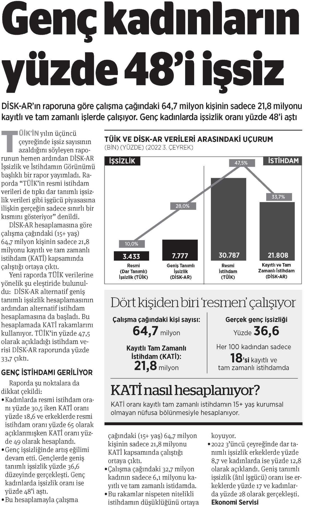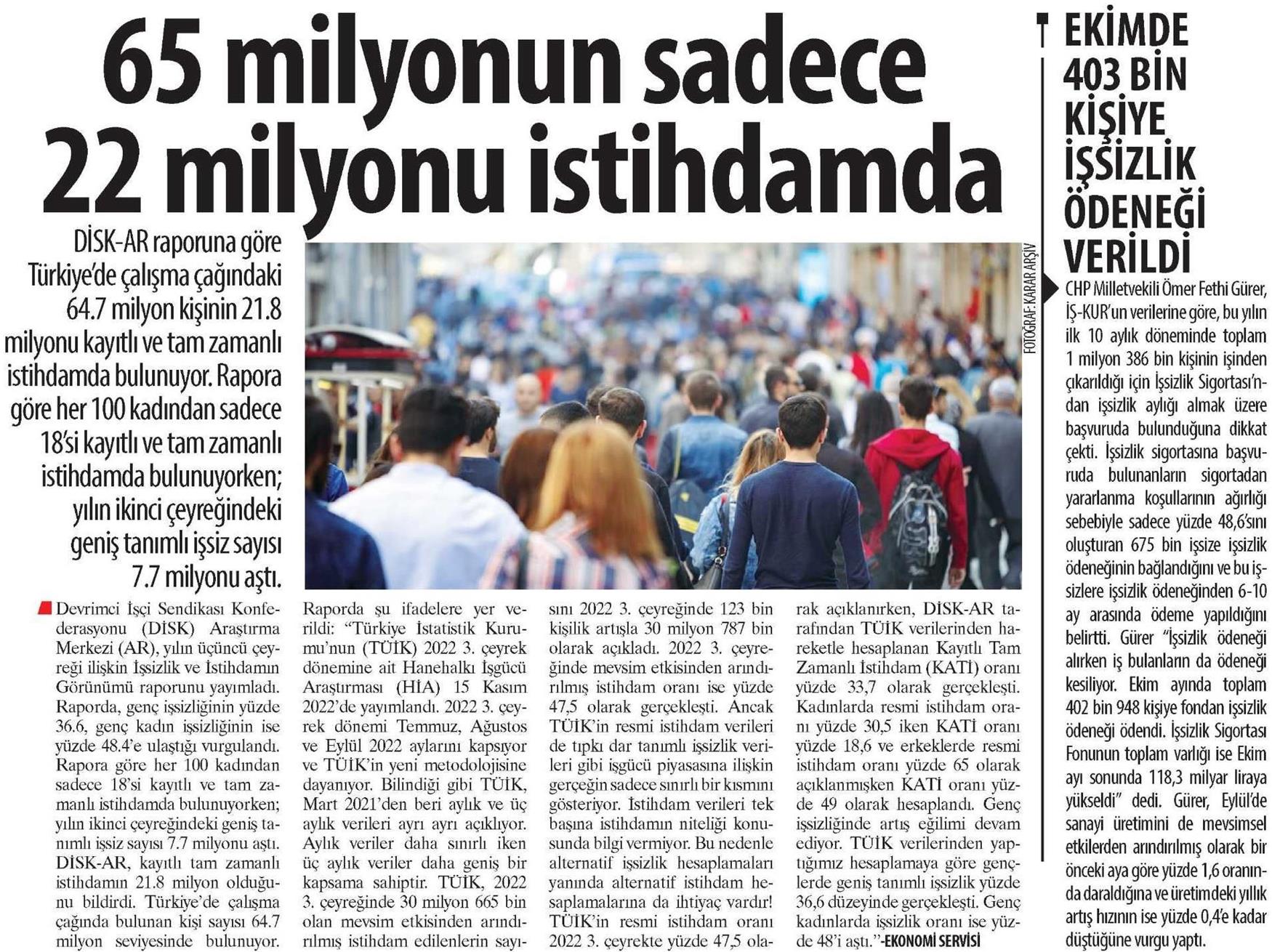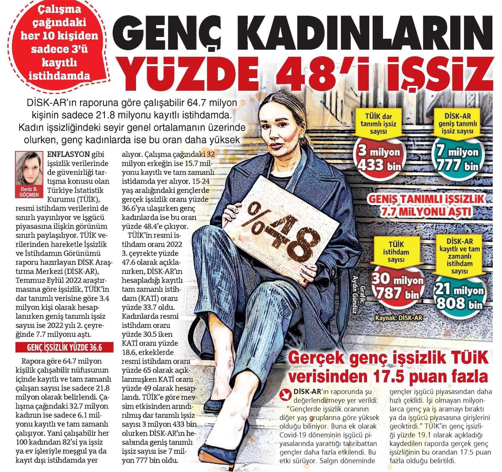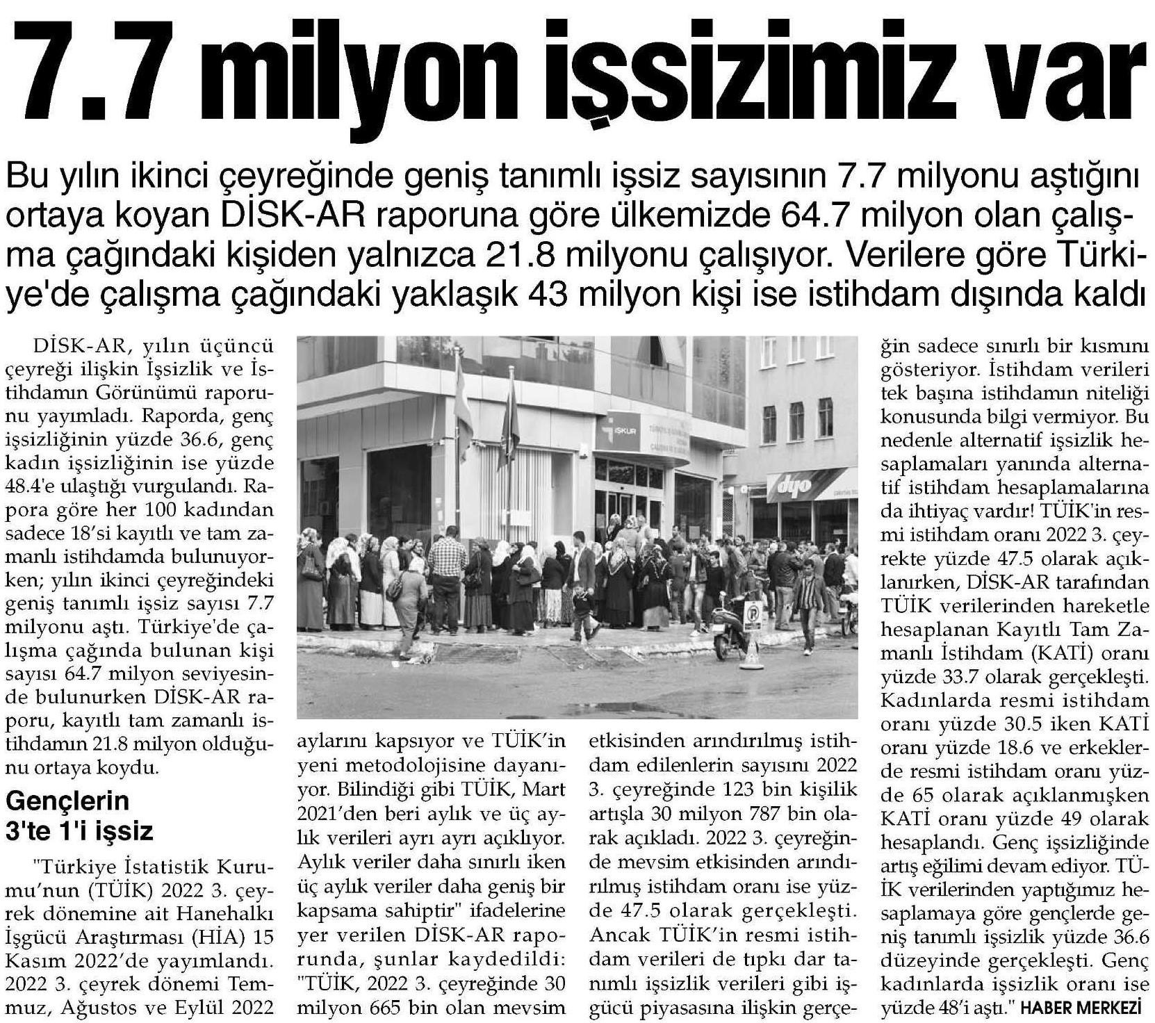DİSK-AR tarafından hazırlanan ve 17 Kasım 2022 günü yayımlanan “İşsizlik ve istihdamın Görünümü (3. Çeyrek)” isimli rapor, 18 Kasım 2022 tarihli yazılı basında yer aldı.