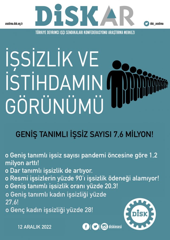DİSK-AR tarafından TÜİK verilerinden yararlanarak yapılan hesaplamaya göre mevsim etkisinden arındırılmış geniş tanımlı işsiz sayısı ise Ekim 2022’de 7 milyon 608 bin kişi olarak gerçekleşti. TÜİK’e göre Ekim 2019’da yüzde 13,5 olan işsizlik Ekim 2022’de yüzde 10,2 olarak gerçekleşti. Ancak aynı yıllarda geniş tanımlı işsizlik yüzde 18,7’den yüzde 20,3’e yükseldi.
