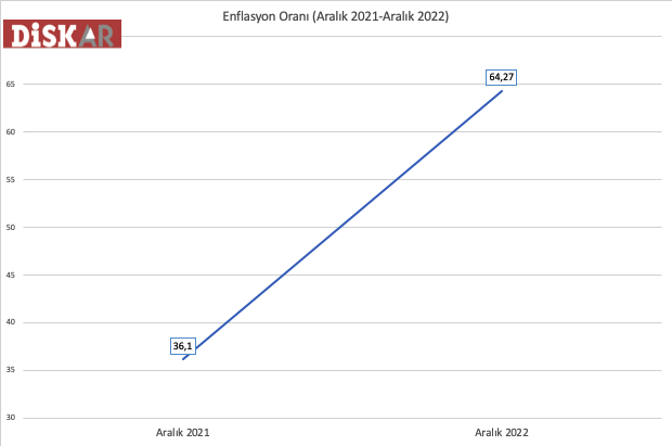 Enflasyon artmaya devam ediyor. Aralık 2021’de yüzde 36,08 olan enflasyon oranı Aralık 2022’de yüzde 64,27 oldu. Böylece enflasyon oranı bir yılda 28,17 puan artmış oldu.