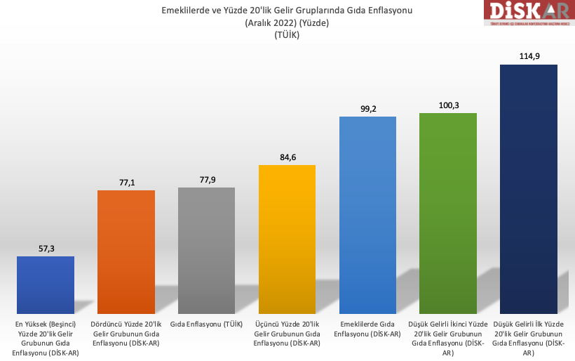 Dördüncü yüzde 20’lik gelir grubunun gıda enflasyonu yüzde 77,1 olurken, en yüksek gelir grubunun gıda enflasyonu ise yüzde 57,3 oldu. Böylece en yoksul gelir grubu yüzde 114,9 oranında gıda enflasyonu hissederken, en yüksek gelir grubu ise yüzde 57,3 oranında gıda enflasyonu hissetmiş oldu. Bu durum enflasyonun gelir gruplarına göre önemli ölçüde farklı hissedildiğini ortaya koyuyor.