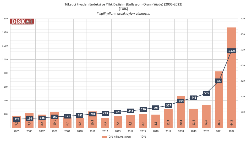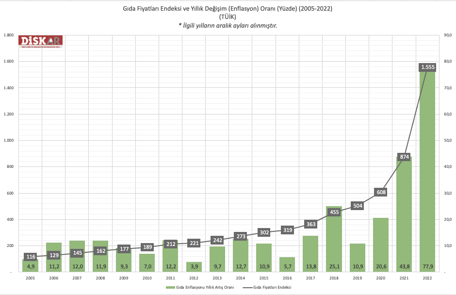 TÜFE ve gıda fiyatları endeksi artmaya devam ediyor. 2005 yılında 123 olan TÜFE, 2022’de 1.128’e yükseldi. 2005’te 116 olan gıda fiyatları endeksi ise 2022’de 1.555’e yükseldi. Böylece 2005’ten bu yana TÜFE 1.005 puan, gıda fiyatları endeksi 1.439 puan arttı. 2005’te yüzde 7,7 olan enflasyon oranı 2022’de yüzde 64,3 oldu. 2005’te yüzde 4,9 olan gıda enflasyonu ise 2022’de yüzde 77,9’a yükseldi.
