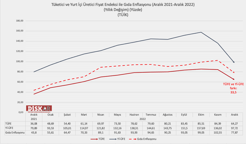 TÜİK’e göre Yurt İçi-Üretici Fiyatları Endeksi (Yİ-ÜFE) (2003=100) ise 2022 Aralık ayında bir önceki aya göre yüzde 0,24 azalarak yüzde 97,72 olarak gerçekleşti. TÜFE ile Yİ-ÜFE arasındaki makas Aralık 2022’de 33,5 puan olarak gerçekleşti.