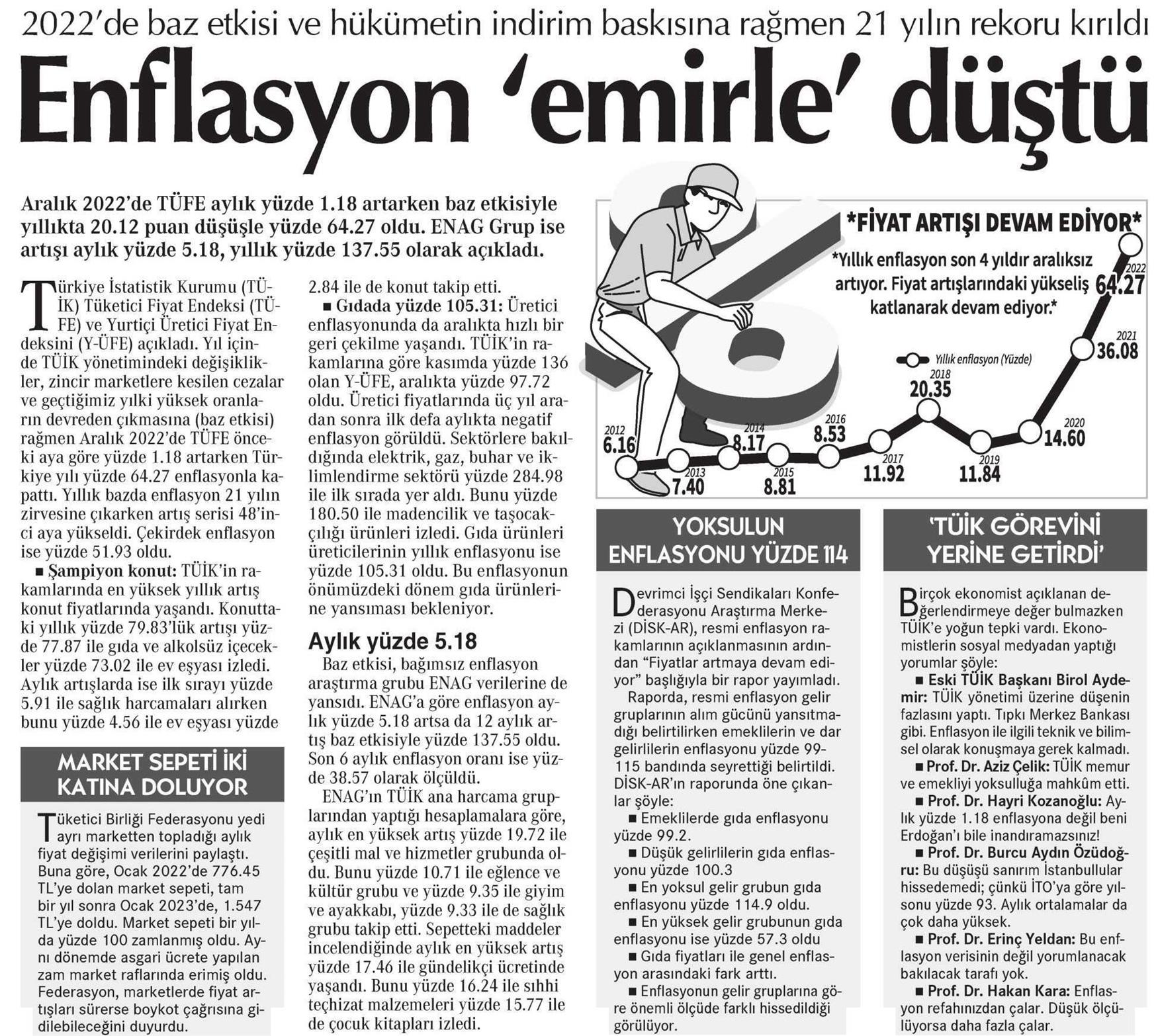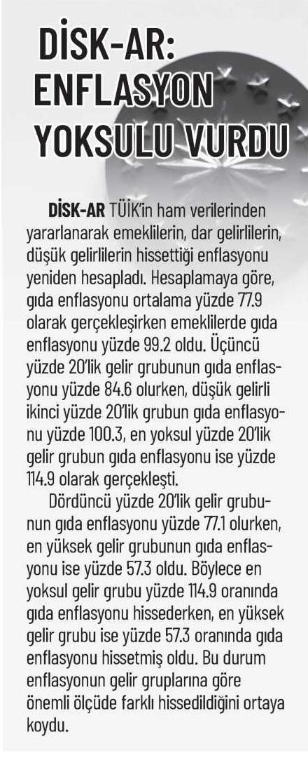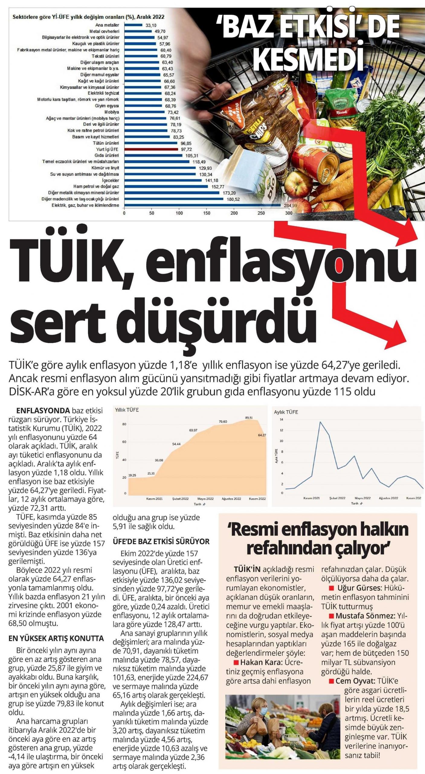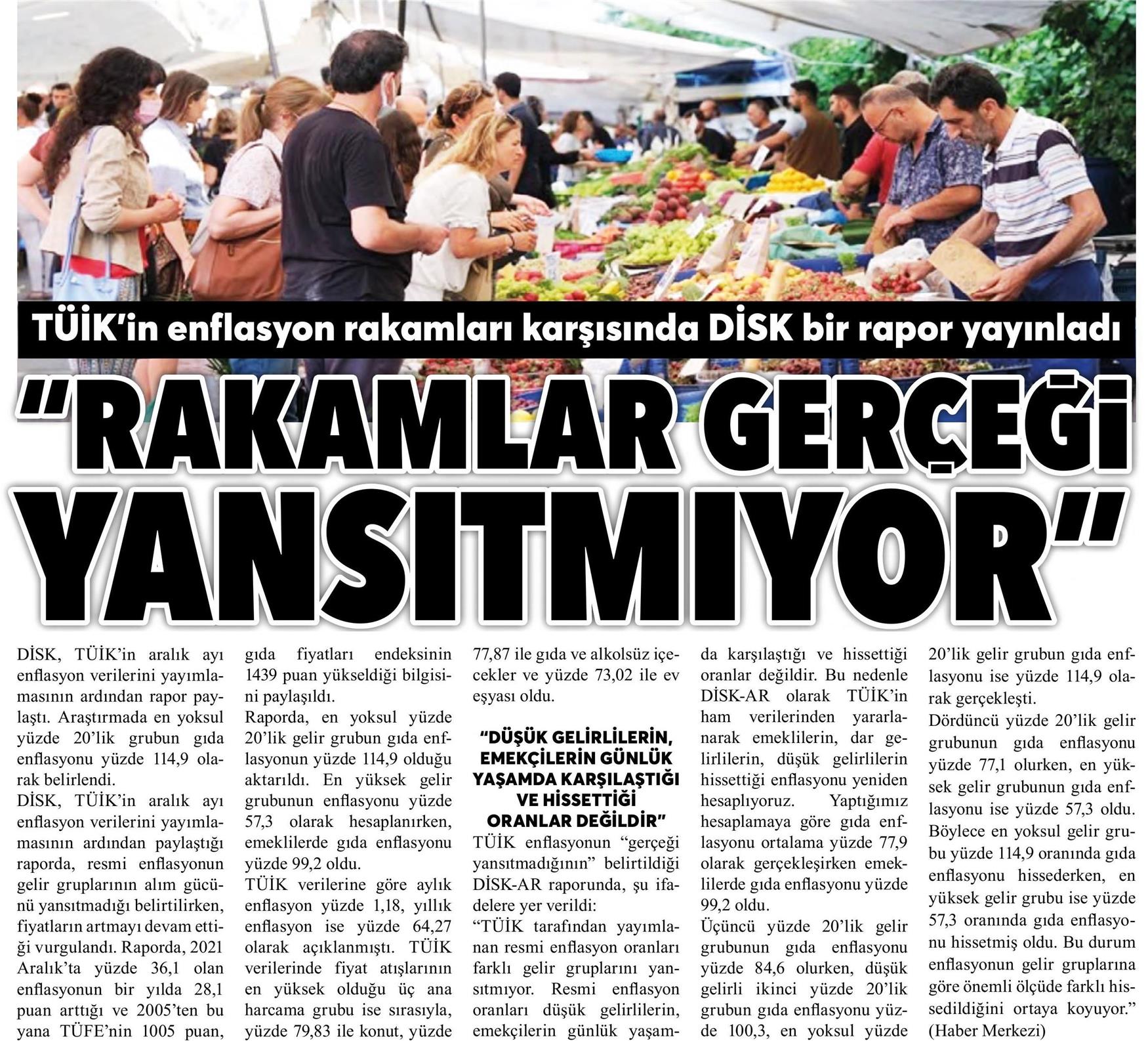 DİSK-AR tarafından hazırlanan ve 3 Ocak 2023 günü yayımlanan “Fiyatlar Artmaya Devam Ediyor” adlı haber bülteni 4 Ocak 2023 tarihli yazılı basında yer buldu.