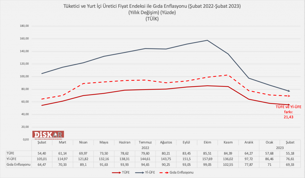 TÜİK’e göre Yurt İçi-Üretici Fiyatları Endeksi (Yİ-ÜFE) (2003=100) ise 2023 Şubat ayında bir önceki aya göre yüzde 1,56 puan artarak yıllık yüzde 76,61 olarak gerçekleşti. TÜFE ile Yİ-ÜFE arasındaki makas Şubat 2023’te 21,4 puan olarak gerçekleşti.