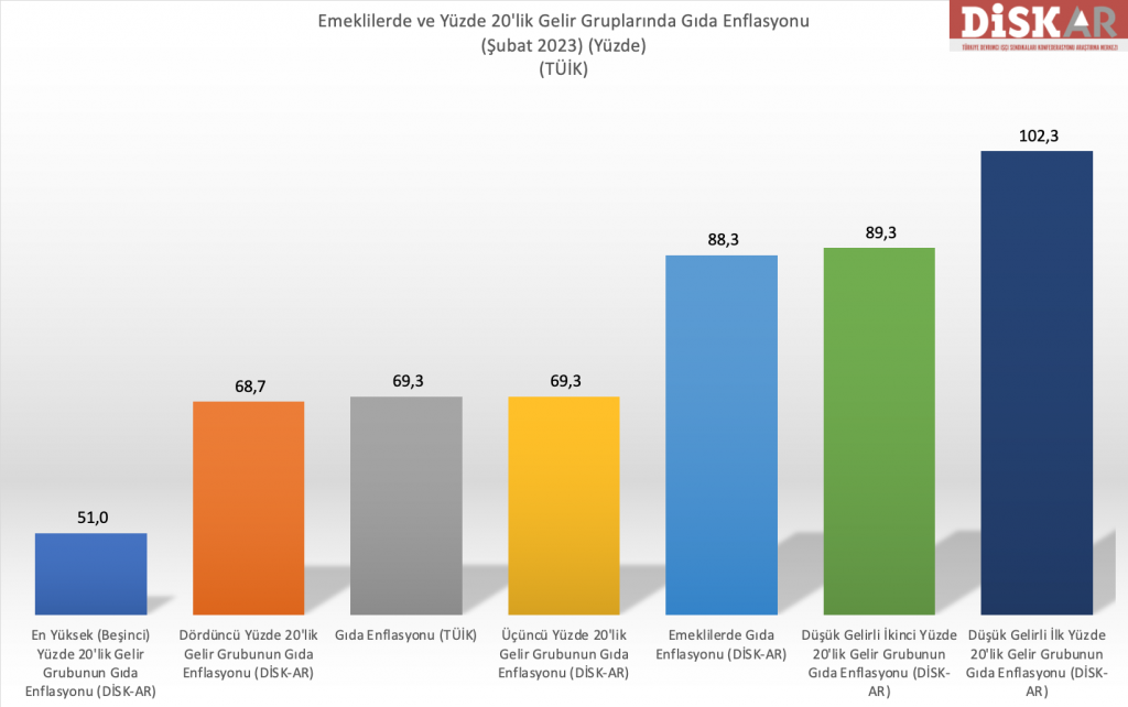 - DİSK-AR tarafından yapılan hesaplamaya göre emeklilerin ve dar gelirlilerin gıda enflasyonu yüzde 88-102 aralığında seyrediyor.