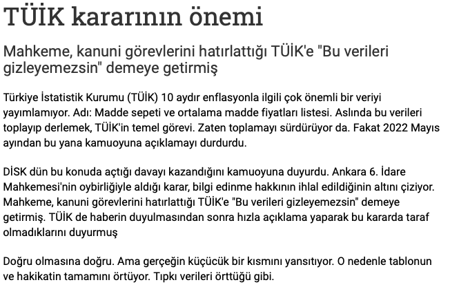 Çiğdem Toker 28 Nisan 2023 tarihli “TÜİK Kararının Önemi” adlı yazısında enflasyon hesaplamasının temelini oluşturan madde fiyat listesinin açıklanmasının durdurulmasına karşı DİSK’in TÜİK’e açtığı davaya değindi.